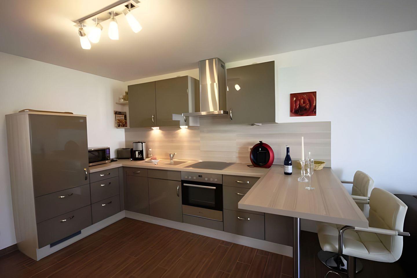 Stühlen. Die offene Einbauküche ist voll ausgestattet mit Geschirrspüler,