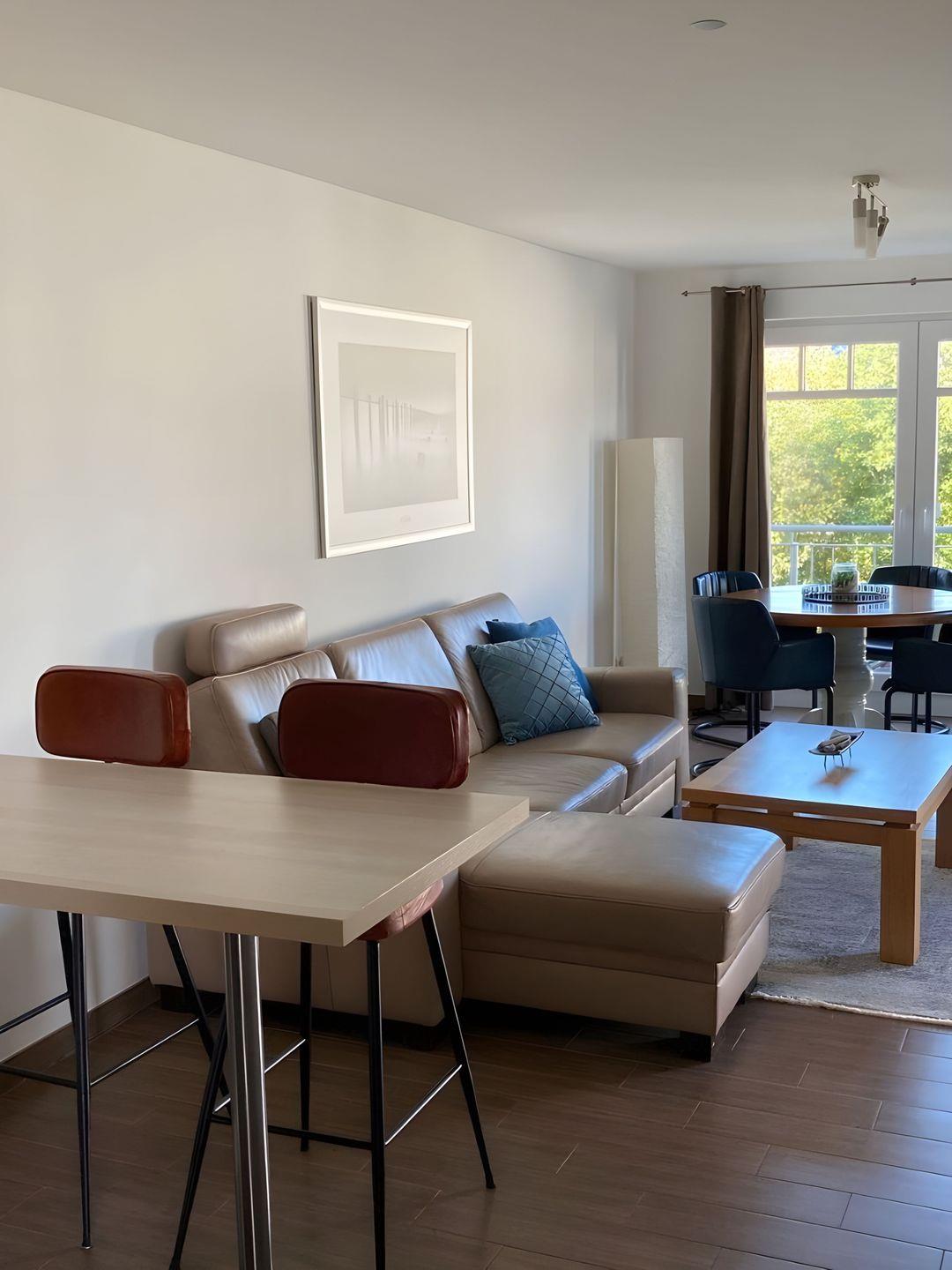 Im Wohn-/ Esszimmer empfangen Sie eine lederne Eckcouch, ein Flatscreen-TV, ein