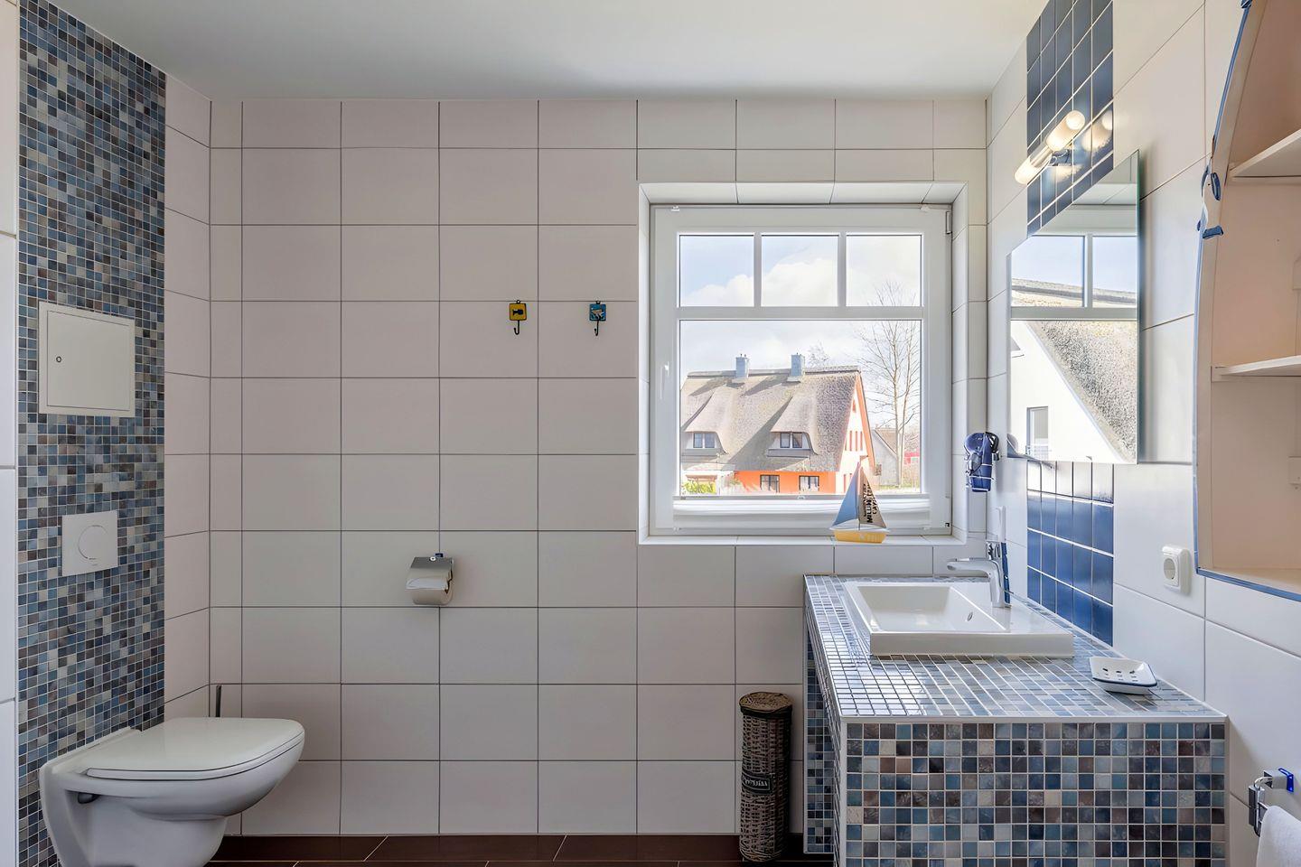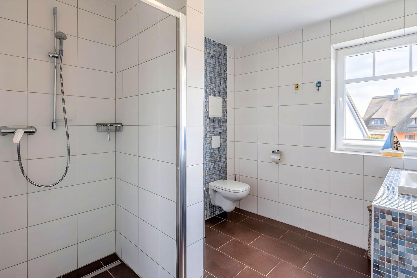 besticht mit Handtuchtrockner, ebenerdiger Dusche und Fön. Eine Fußbodenheizung