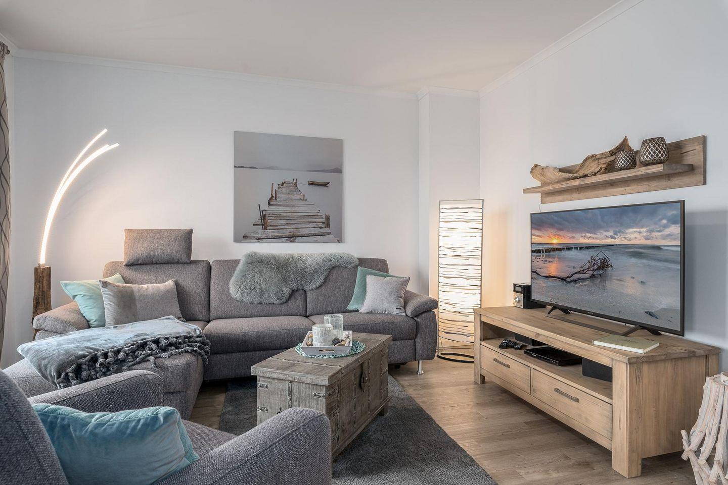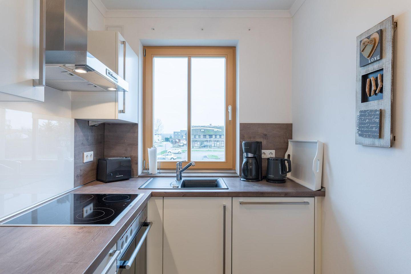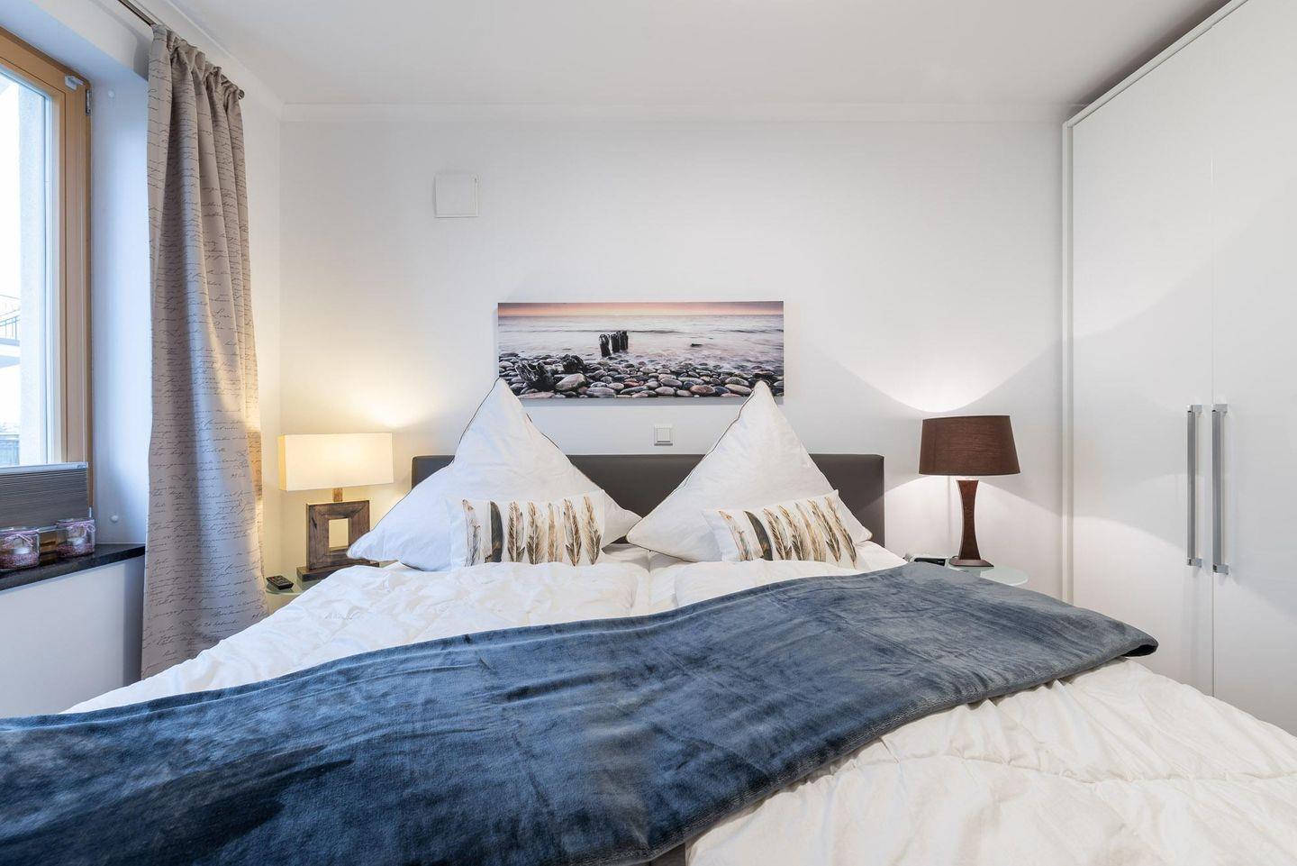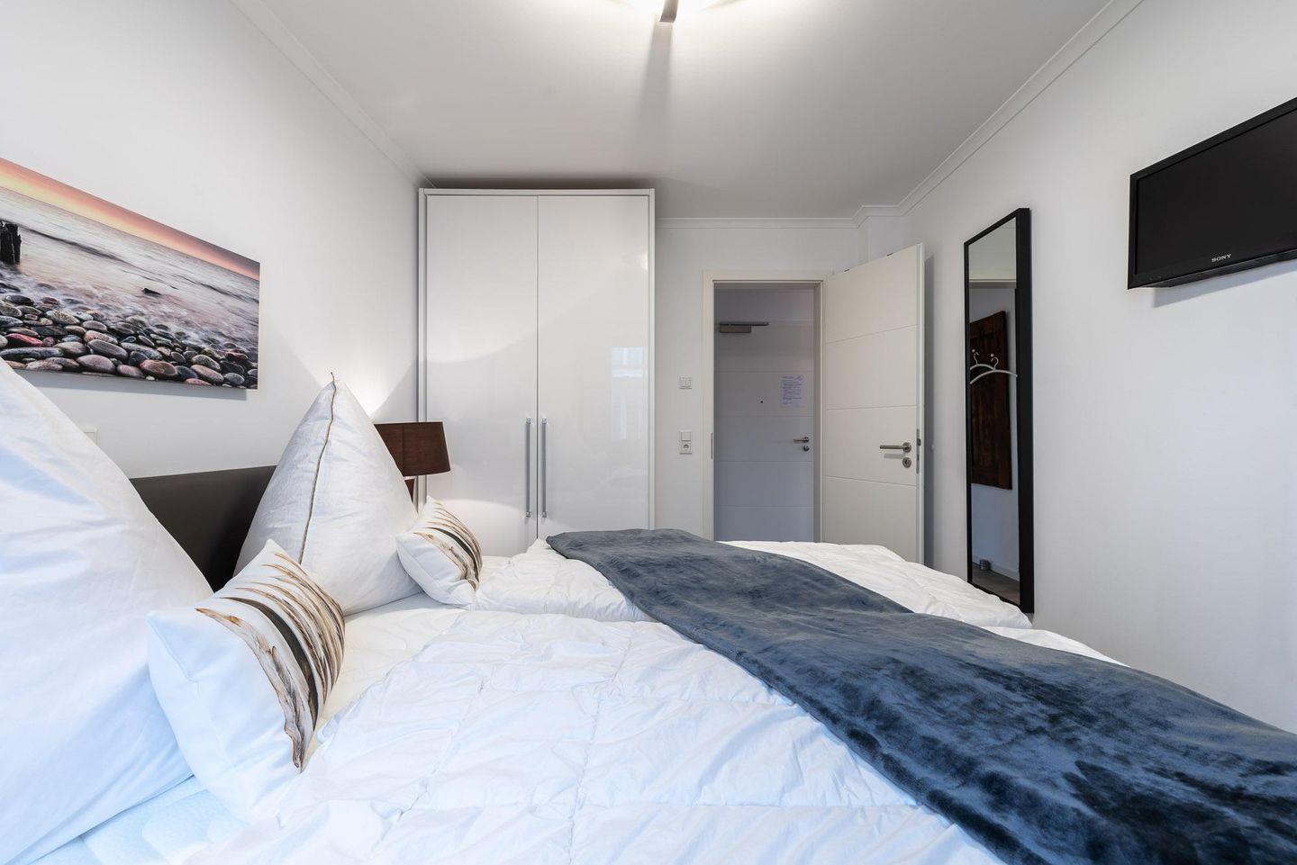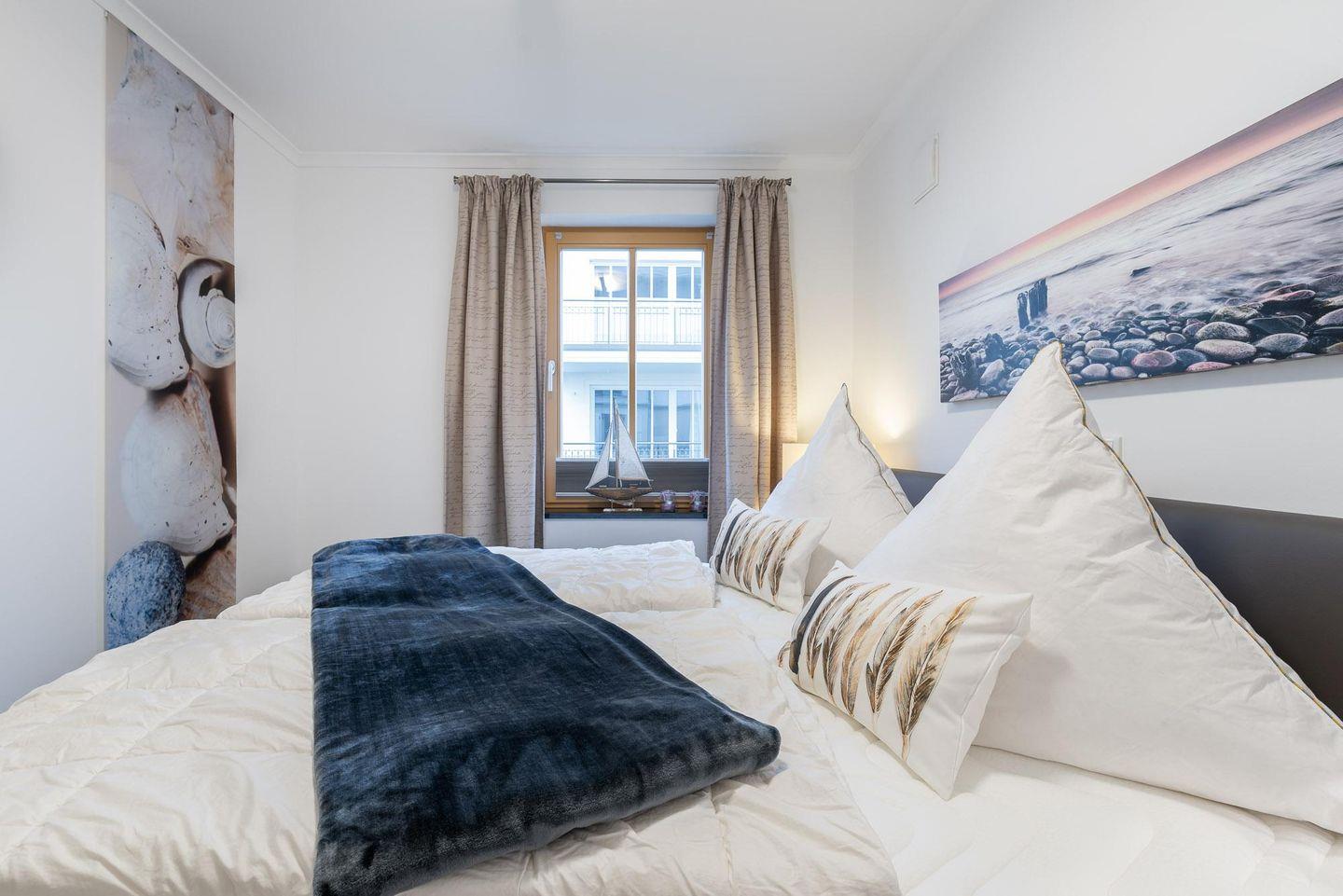 Die geschmackvoll eingerichtete Ferienwohnung befindet sich im ersten Obergeschoss der Villa Sanddorn und bietet Platz für drei Personen. Der WOHNRAUM verfügt über eine große, bequeme Eck-Couch, einen Sessel, einen TV und eine Stereoanlage. An kühlen Tagen schafft der HOLZKAMIN wohlige Wärme und ein reizvolles Flammenspiel (Brennholz ist selbst mitzubringen.) Im SCHLAFZIMMER befinden sich ein großes Doppelbett (180 cm x 200 cm), ein geräumiger Kleiderschrank sowie ein an der Wand befestigter Fernseher mit integriertem DVD-Player. Im offenen KÜCHEN- UND ESSBEREICH befindet sich die gut ausgestattete Einbauküche mit Cerankochfeld, Backofen, Mikrowelle, Kühlschrank, inklusive Gefrierfach sowie ein schöner Holztisch mit vier Freischwingern in Lederoptik. Auf dem großzügigen, nach Nordwesten ausgerichteten BALKON können Sie die Nachmittags- und Sonnenuntergangsstimmung (eingeschränkter Meerblick) genießen. Das elegante BAD besitzt eine bodengleiche Dusche, einen großzügigen Waschtisch sowie einen Spiegel, Der sich an die Breite des Waschtischs anpasst. Zu der Ferienwohnung gehört ein KOSTENFREIER AUSSENSTELLPLATZ (ca. 30 m vom Objekt entfernt). Am Eingang zur Villa befinden sich zudem FAHRRADSTÄNDER. Der im Gebäude installierte Aufzug erleichtert den Transport der mitgebrachten Koffer. Die Unterkunft ist komplett mit einer Fußbodenheizung versehen worden. HINWEISE: Das kostenfreie WLAN in der Unterkunft ist ausschließlich für die Verwendung von Social Media und den Austausch von Bildern mit Familie und Freunden gedacht. Die Nutzung zum Streamen von Filmen ist nicht vorgesehen. Es handelt sich um eine Nichtraucherwohnung. Es sind KEINE HAUSTIERE erlaubt. Wäscheset, Kinderreisebett und Kinderhochstuhl können kostenpflichtig zugebucht werden. Eine Waschmaschine und ein Trockner stehen im separaten Hauswirtschaftsraum im Erdgeschoss des Objekts zur Verfügung (gegen Gebühr/ Münzautomat). In der Hauptsaison wird für die dritte Person ein Aufpreis in Höhe von 10,00 €/ÜN berechnet. Sichern Sie sich den Anspruch auf einen der begehrten STRANDKÖRBE (Anfang Mai - Ende August) und buchen Sie jetzt zu besonderen Konditionen (12,00 € pro Tag oder 75,00 € pro Woche).