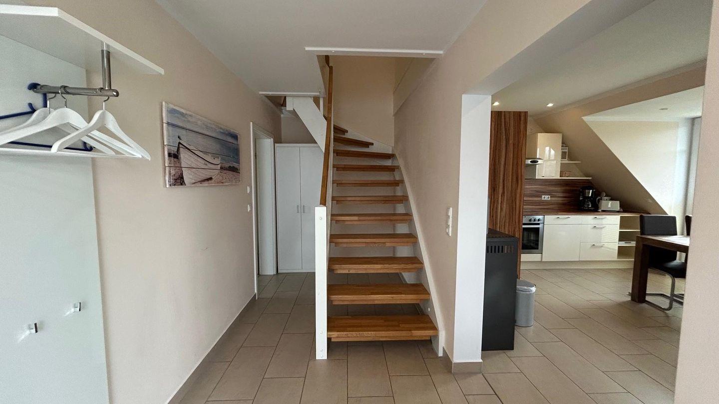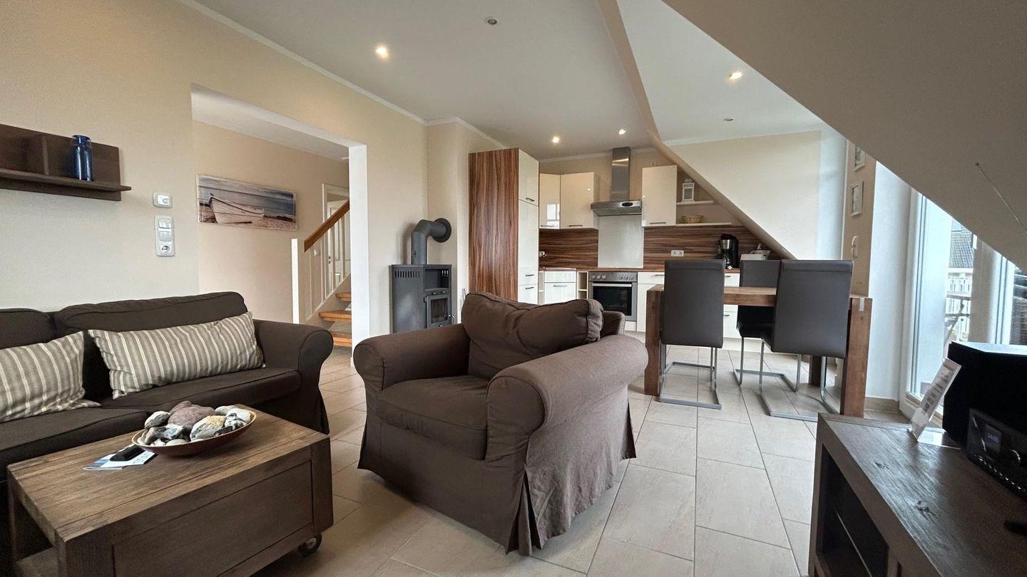Die Wohnung verfügt über einen lichtdurchfluteten Wohnbereich, der mit einem gemütlichen Kaminofen ausgestattet ist – perfekt für entspannte Stunden bei kühlen Abenden. Zwei separate Schlafzimmer mit komfortablen Doppelbetten und ausreichend Stauraum in den Kleiderschränken bieten viel Platz für bis zu vier Personen. Das zweite Schlafzimmer erreichen Sie über eine innenliegende Treppe auf der oberen Ebene, die zusätzlichen Raum und Privatsphäre bietet.