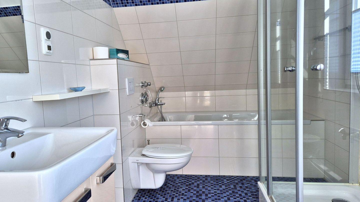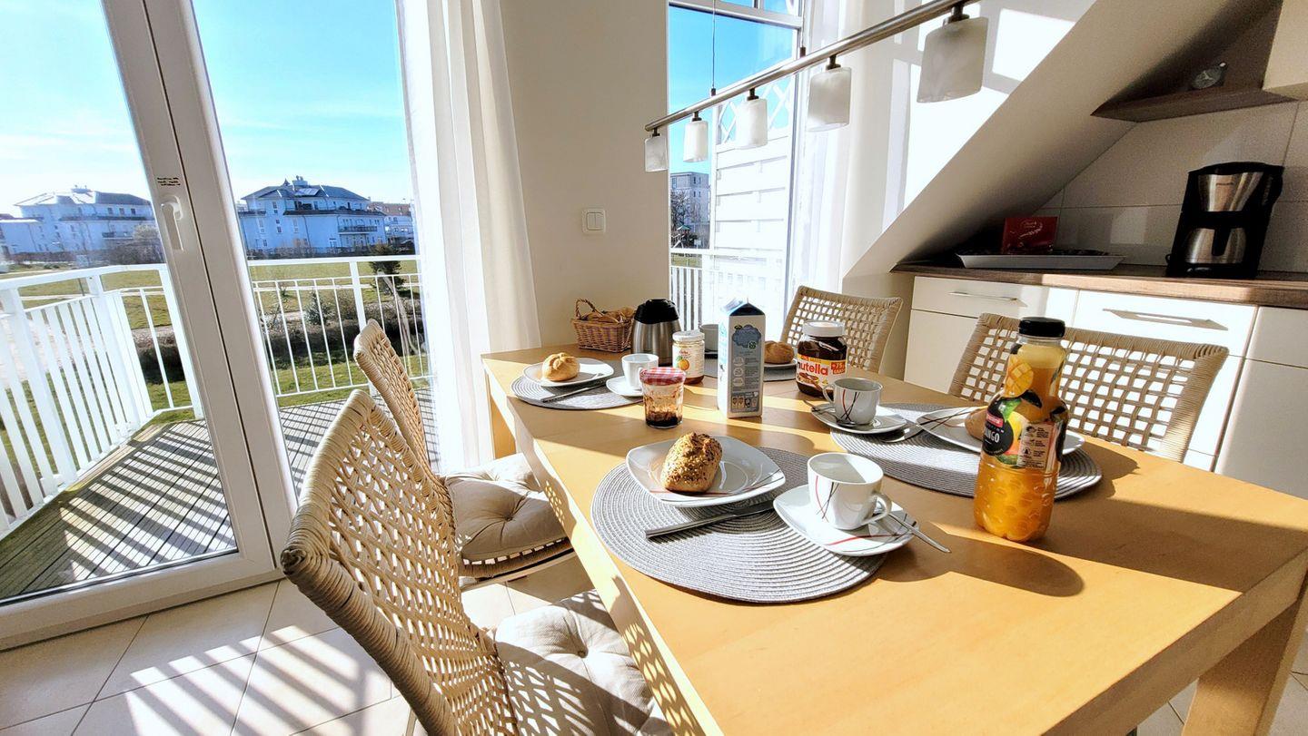 Die großzügige 3-Zimmer Maisonette mit frischem Flair bietet auf zwei Wohnebenen einen offenen Wohn- und Essbereich, 2 Schlaf- und 1 Badezimmer, eine Frühstücksterrasse mit Morgensonne und einen sonnigen S/W-Balkon mit wunderschönem Blick auf den hauseigenen Garten und den Park von Börgerende. Das modern und mit Liebe zum Detail eingerichtete Feriendomizil ist vollständig ausgestattet und stellt Ihnen während des Aufenthaltes unter anderem kostenloses WLAN, einen Flat-TV mit Blu-ray- / DVD-Player und kleiner Mediathek, sowie eine Musikanlage mit kabelloser Wiedergabe vom eigenen Mobiltelefon / Tablet zur Verfügung (Internet-Radio, Podcasts, Spotify, e.t.c.). Für die Zubereitung kulinarischer Genüsse steht eine geräumige Einbauküche mit Kühlschrank inkl. Gefrierfach, Backofen, Mikrowelle, Ceran-Kochfeld, Dunstabzugshaube, Kaffeemaschine, Wasserkocher, Toaster und Geschirrspüler bereit. Die Fußbodenheizung sorgt für wohlige Wärme in allen Räumen und ein knisternder Kaminofen verbreitet an entspannten Abenden besondere Gemütlichkeit. Direkt vor dem Haus stehen Ihnen ein eigener PKW-Stellplatz als auch Ständer zum Anschließen der Fahrräder zur Verfügung.