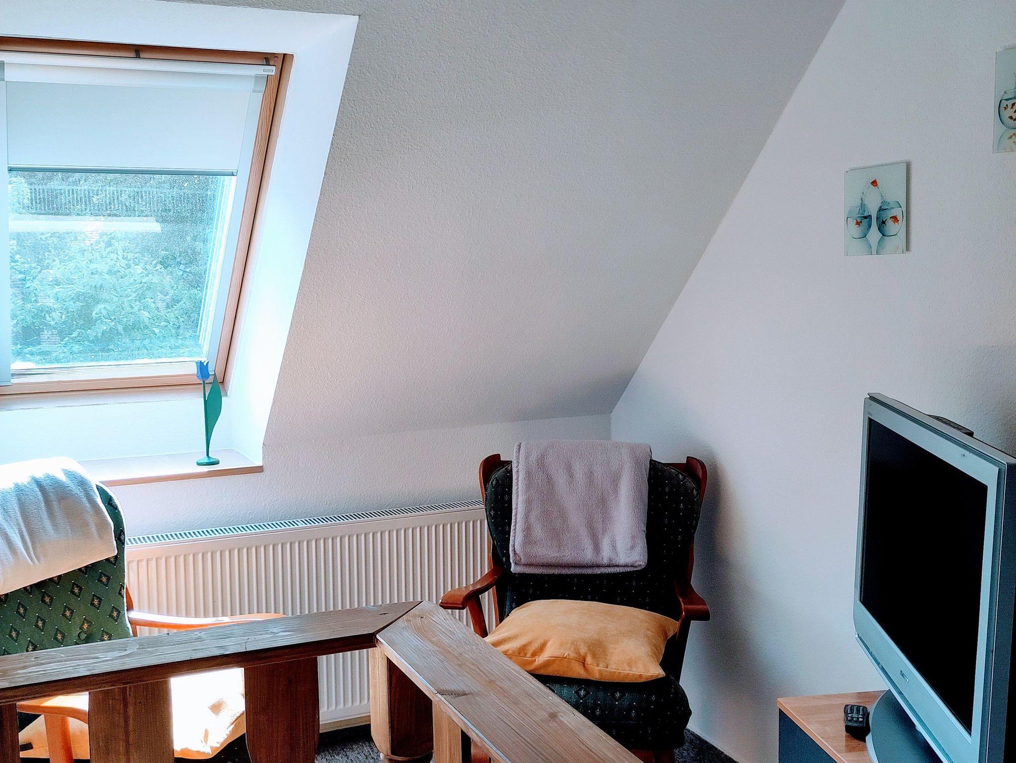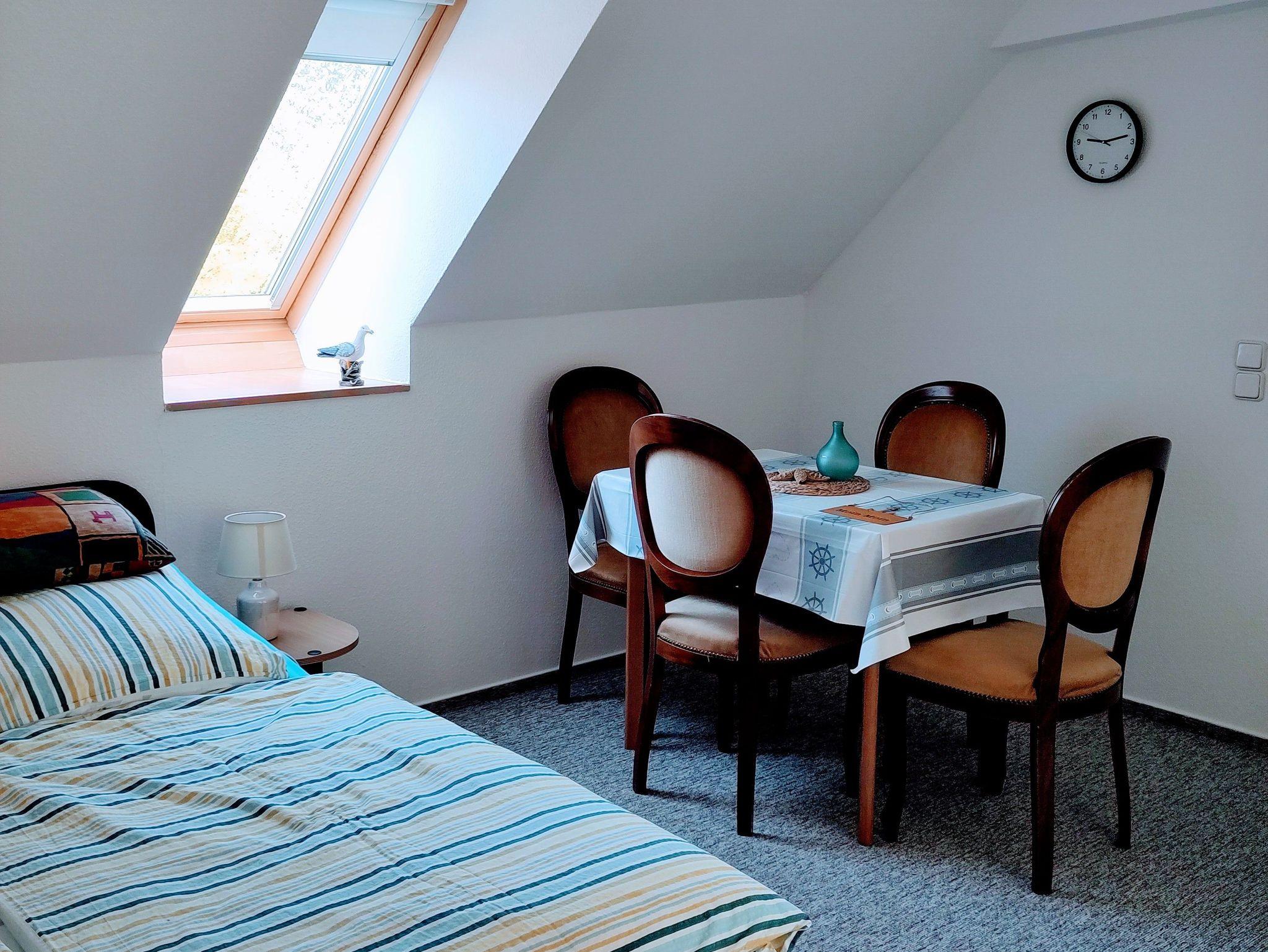 Weiterhin befindet sich oben ein zweiter Wohn-/Schlafraum und ein dazugehöriges zweites Bad. Das Wohn-/Schlafzimmer ist mit einem Esstisch 4 Stühle, Sessel, (TV) und Doppelbett (1,80 x 2,00 m) ausgestattet.