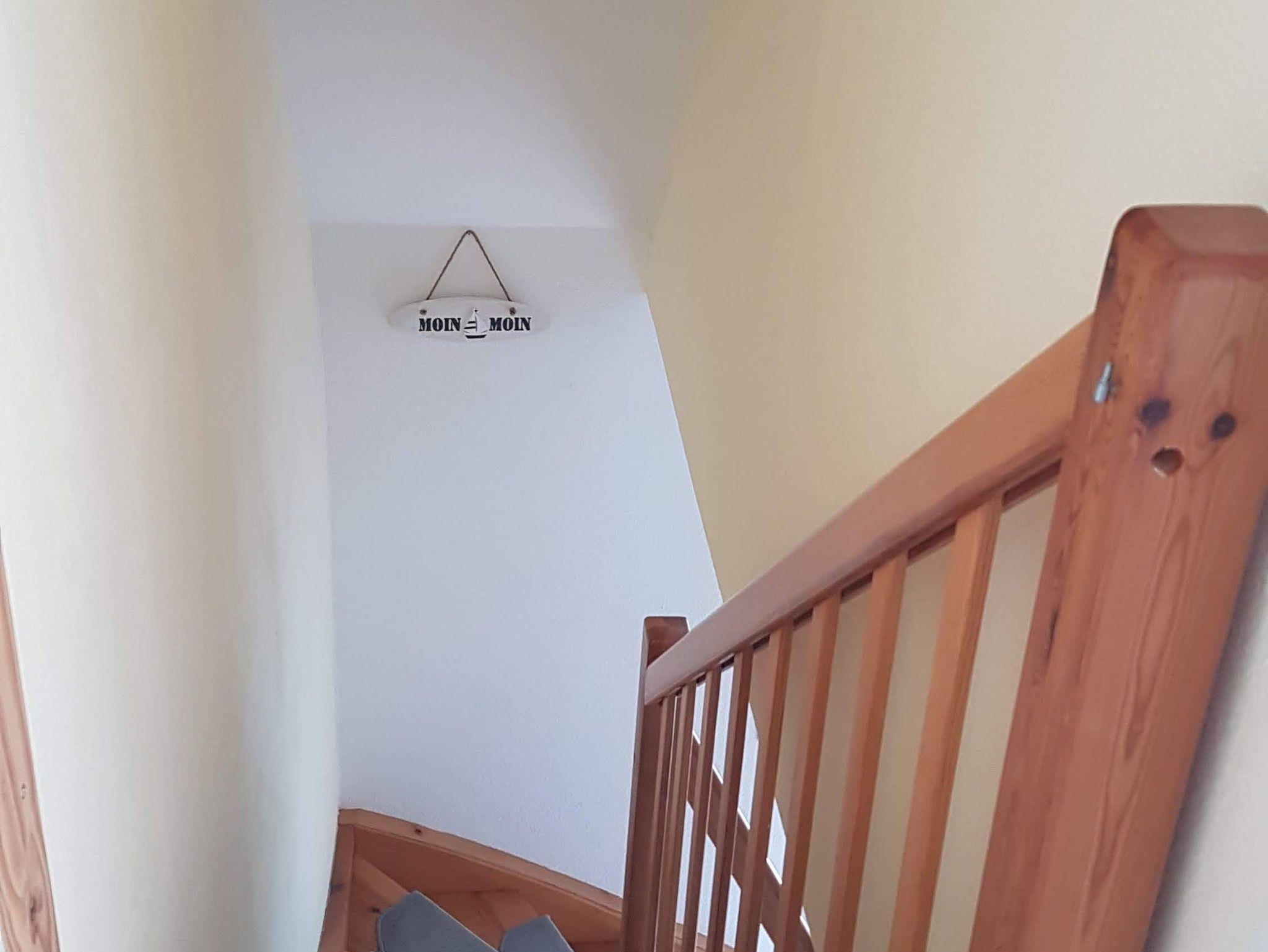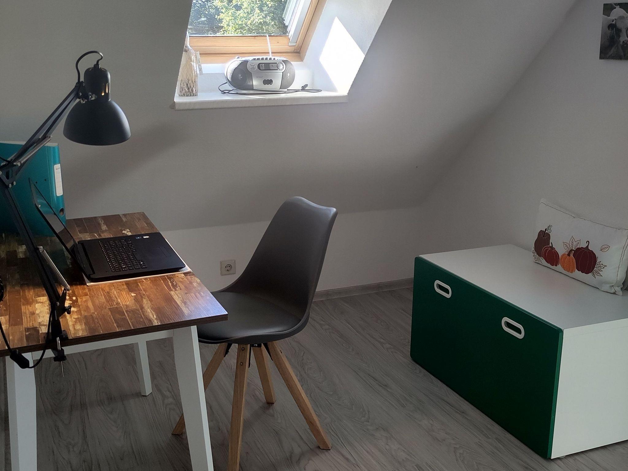 Separate Wohnhaushälfte, unten Küche (kompl. eingerichtete Küche mit div. elektrischen Geräten, E-Herd, Kühlschrank mit Gefrierfach), Tisch für bis zu 4 Personen, Du/WC, (Fön), über Treppe zu erreichen, ein Vorraum (Schreibtisch, Radio).