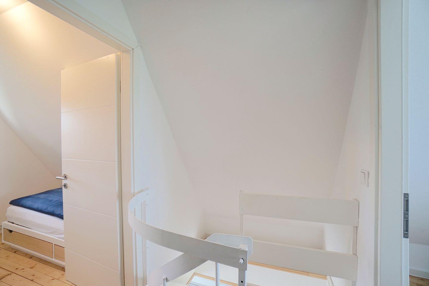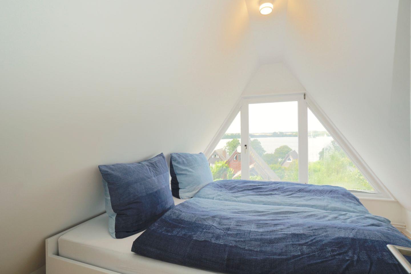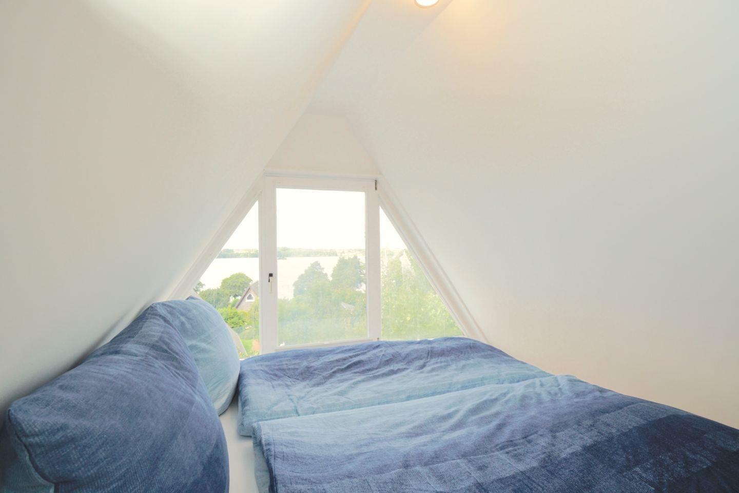 Eine Wendeltreppe die den Wohn- Essbereich von der Küche trennt, führt in das obere Stockwerk. Hier befinden sich unter den schrägen Wänden die beiden Schlafzimmer. Das Doppelbettschlafzimmer gibt einen herrlichen Blick auf den Wittensee frei. Das Schlafzimmer mit den zwei Einzelbetten zeigt in Richtung der ruhigen Wohnsiedlung und eignet sich auch optimal als Kinderschlafzimmer. Auch zwei Rausfallschutzgitter sind für den sicheren Schlaf dort vorhanden.