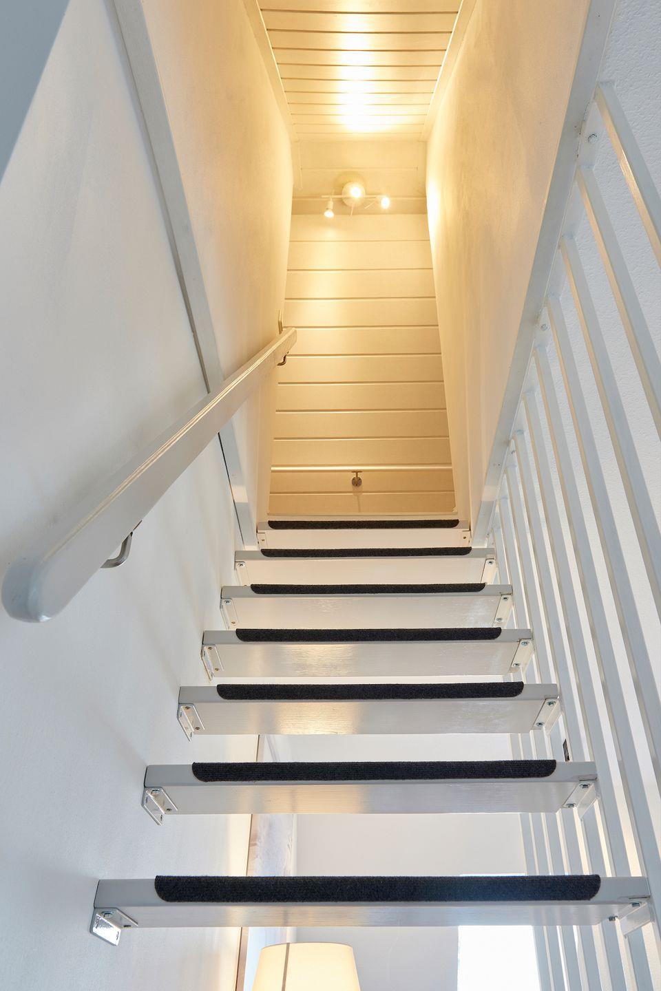 Über eine steile (!) Treppe gelangt man in das Obergeschoss der bezaubernden Ferienwohnung. Hier befinden sich zwei Schlafzimmer mit jeweils zwei Einzelbetten. Auch hier sind die Farben hell und freundlich, passend zum Gesamtbild der Unterkunft. Alle Schlafzimmer verfügen über Verdunklungsplissees und Insektenschutzgitter. Die Treppe ist von unten und oben mit Treppenschutzrollos gesichert, so dass Kleinkinder nicht eigenständig den Weg gehen oder krabbeln können.