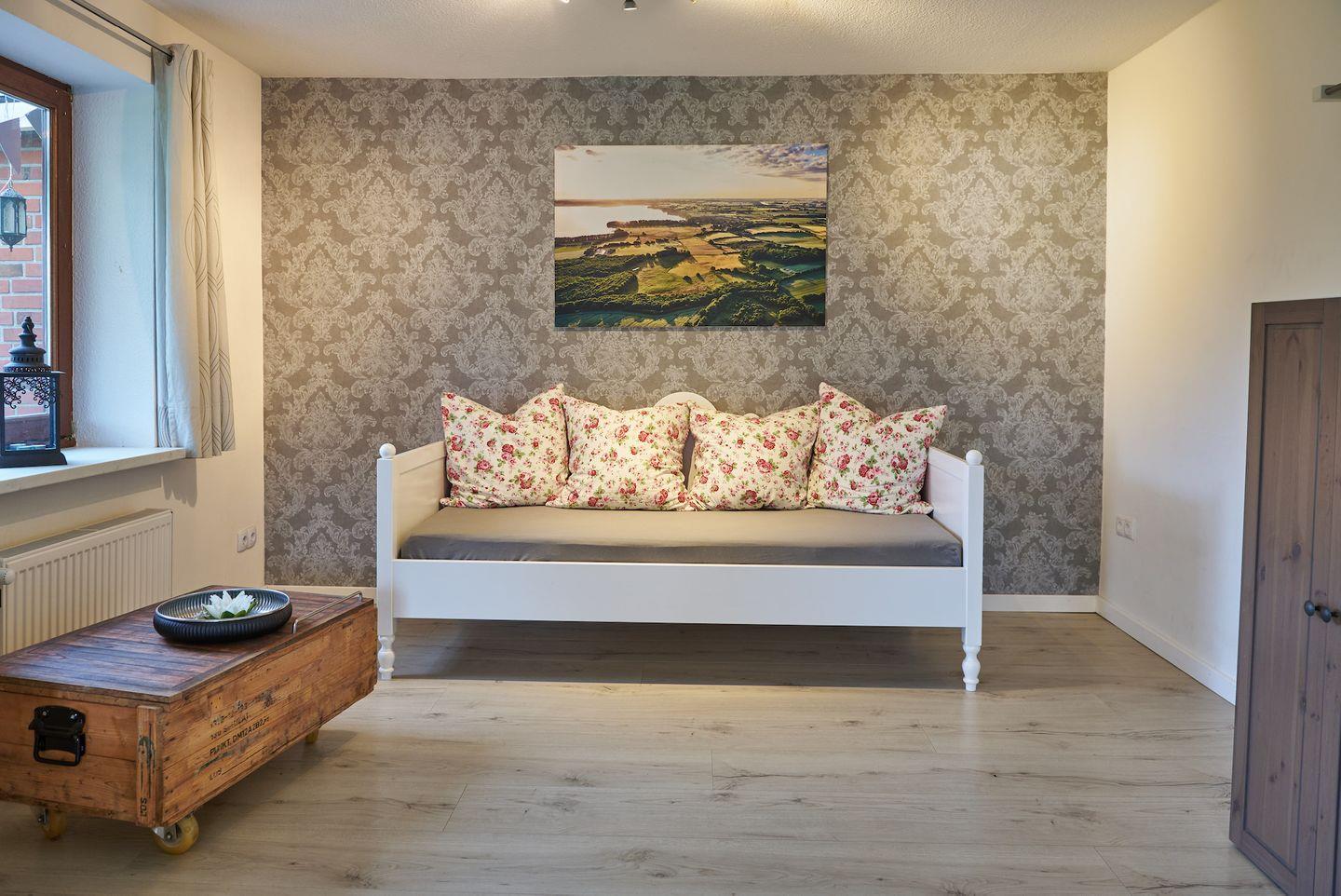 Die Ferienwohnung Waterkant wurde im modernen skandinavischen Stil eingerichtet und liegt im Erdgeschoss eines Ferienhauses auf dem Resthof am Wittensee. Das große Wohnzimmer lädt zum Entspannend und Erholen vom Alltag ein. Hier befindet sich auch die Schlafmöglichkeit für eine fünfte Person: ein durch einen Vorhang abgetrennter Bereich mit einem bequemen Tagesbett. Vom Wohnzimmer aus gelangt man auch auf die große und überdachte Terrasse und in den Garten der Ferienwohnung, der zur alleinigen Nutzung für euch als Gäste der Wohnung Waterkant zur Verfügung steht. Gartenmöbel und auch Gartenliegen gehören selbstverständlich dazu.