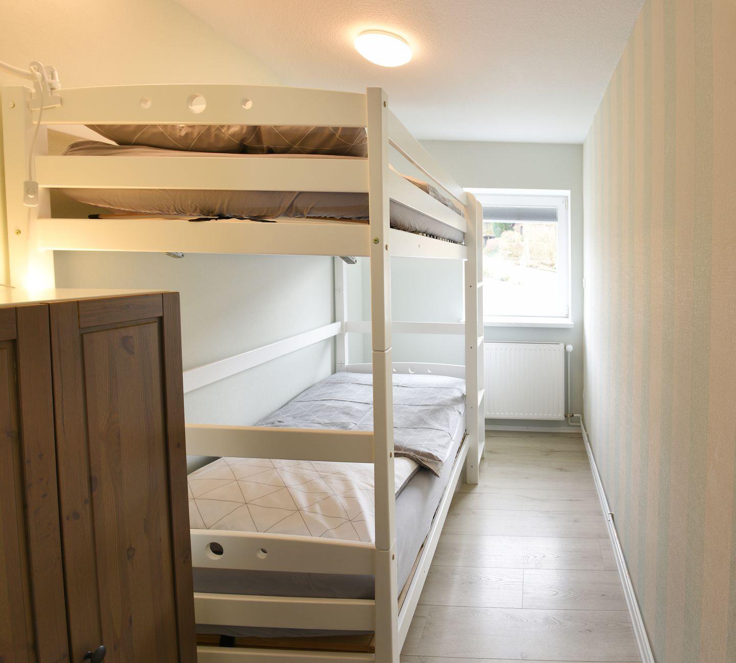 Es gibt ein großes Elternschlafzimmer mit Doppelbett und ein kleines Kinderzimmer mit Etagenbett. Beide Schlafzimmer sind mit Verdunklungsplissees ausgestattet, auch hier wurde bei der Einrichtung auf liebevolle Details großen Wert gelegt.