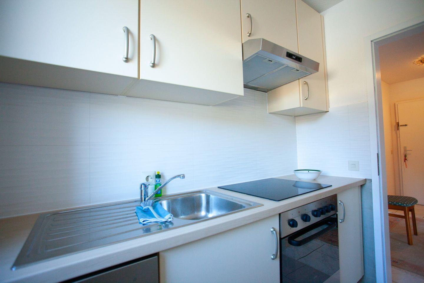 Die geschlossene Küche ist funktional und vollständig ausgestattet mit Vier-Platten-Herd, Backofen, Kühl-Gefrier-Kombination, Spülmaschine, Kaffeemaschine, Wasserkocher und Toaster – ideal für flexible Urlaubstage.