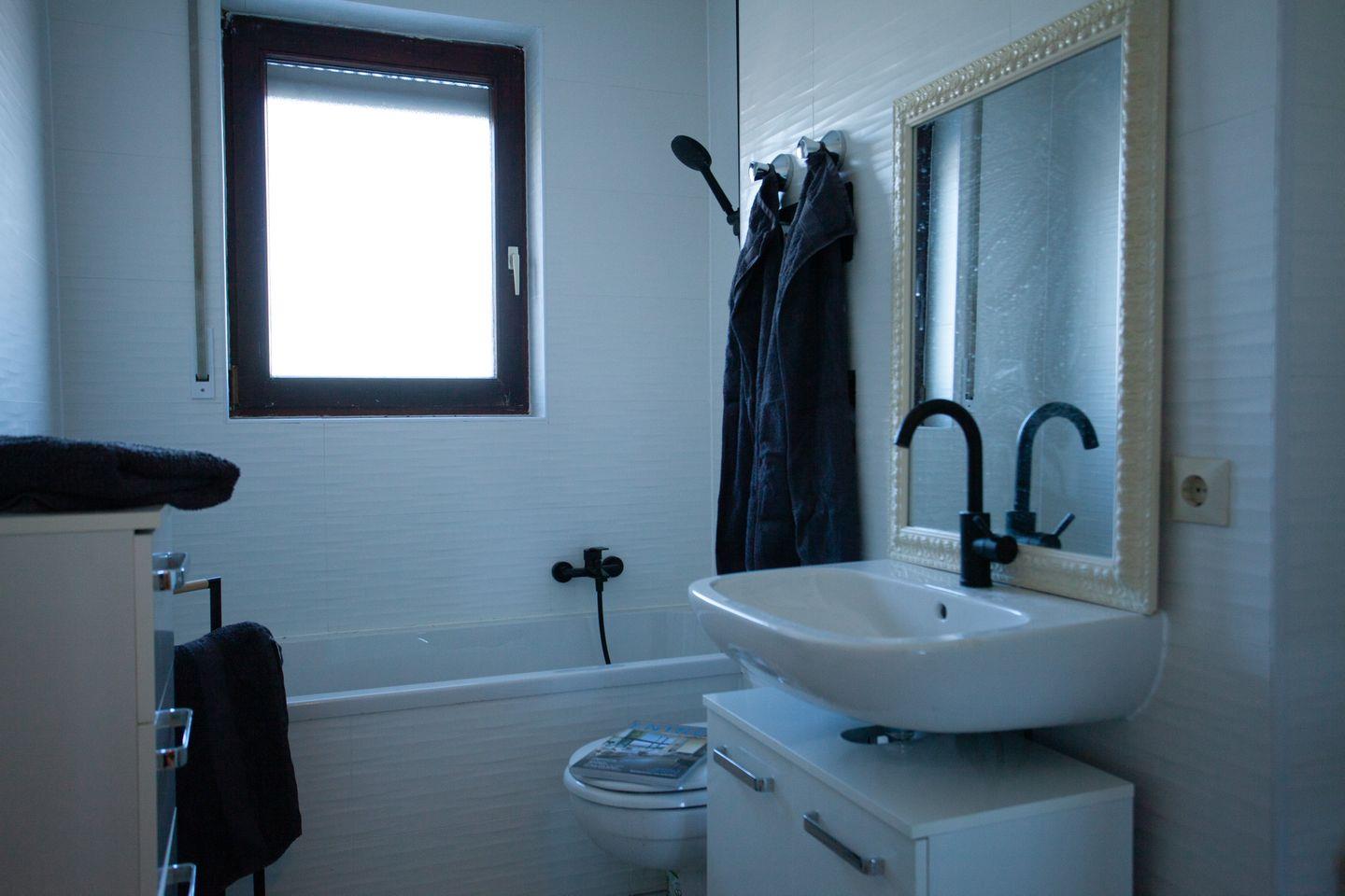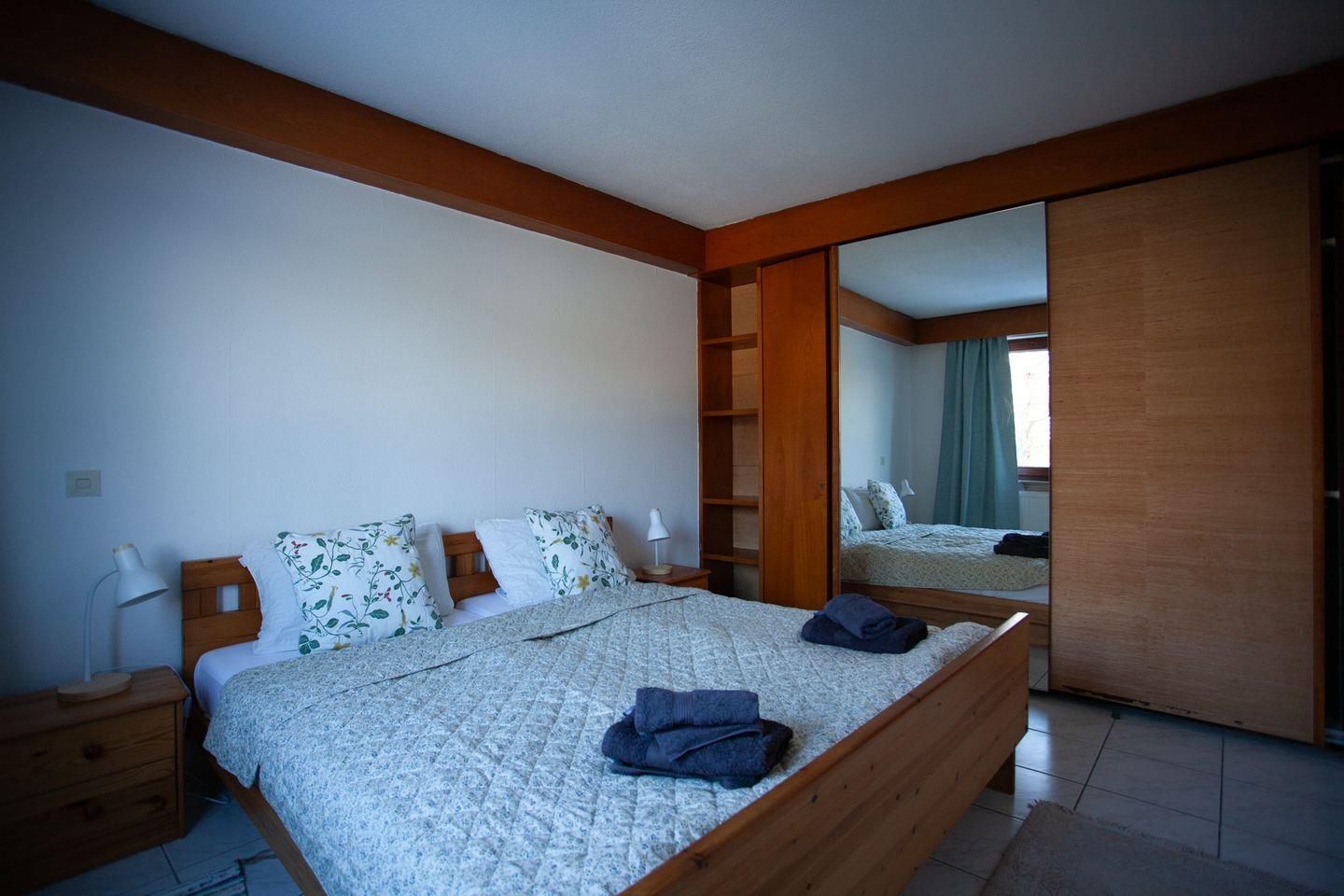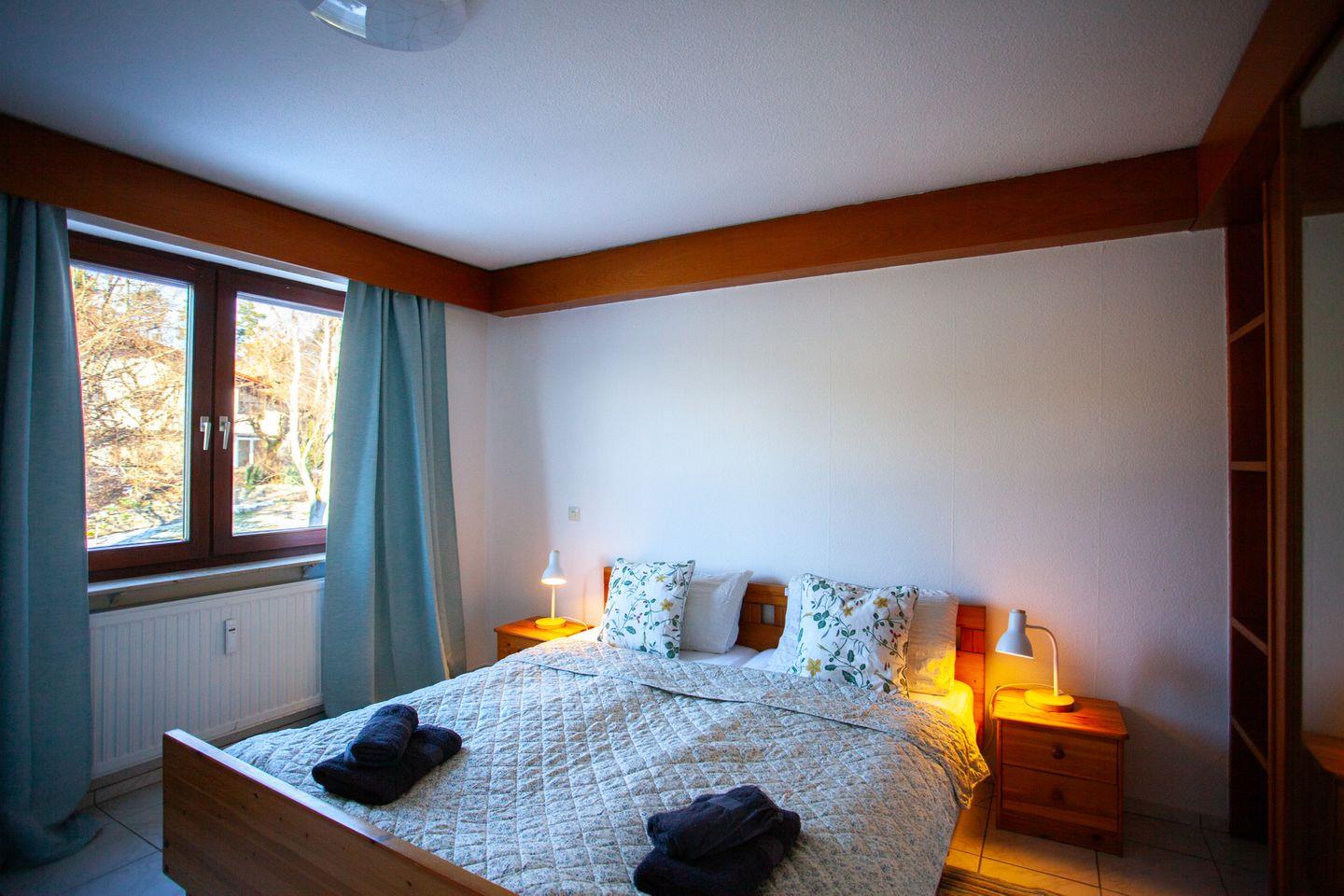 Das separate Schlafzimmer ist mit einem Doppelbett ausgestattet und bietet eine ruhige Rückzugsmöglichkeit. Das Badezimmer verfügt über eine Badewanne, WC und Waschbecken. Waschmaschine und Trockner stehen ebenfalls zur Verfügung – ein echter Komfortvorteil.