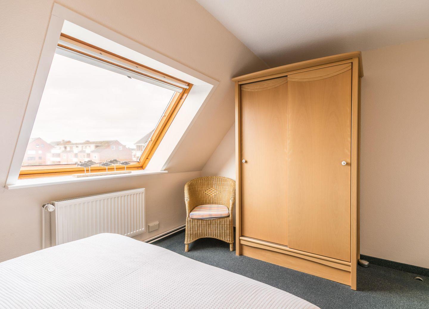 Doppelbett mit getrennten Matratzen (1,60x2,00m), Kleiderschrank 2-türig, Sessel, Verdunkelungsjalousie