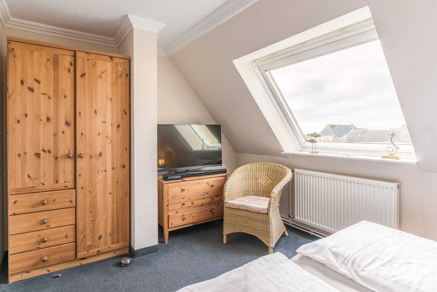 Doppelbett mit getrennten Matratzen (1,80x2,00m ), Lattenrost Kopf- und Fußteil höhenverstellbar, Kleiderschrank 2-türig, Flachbild-TV, Korbstuhl, Teppichboden, Verdunkelungsjalousie