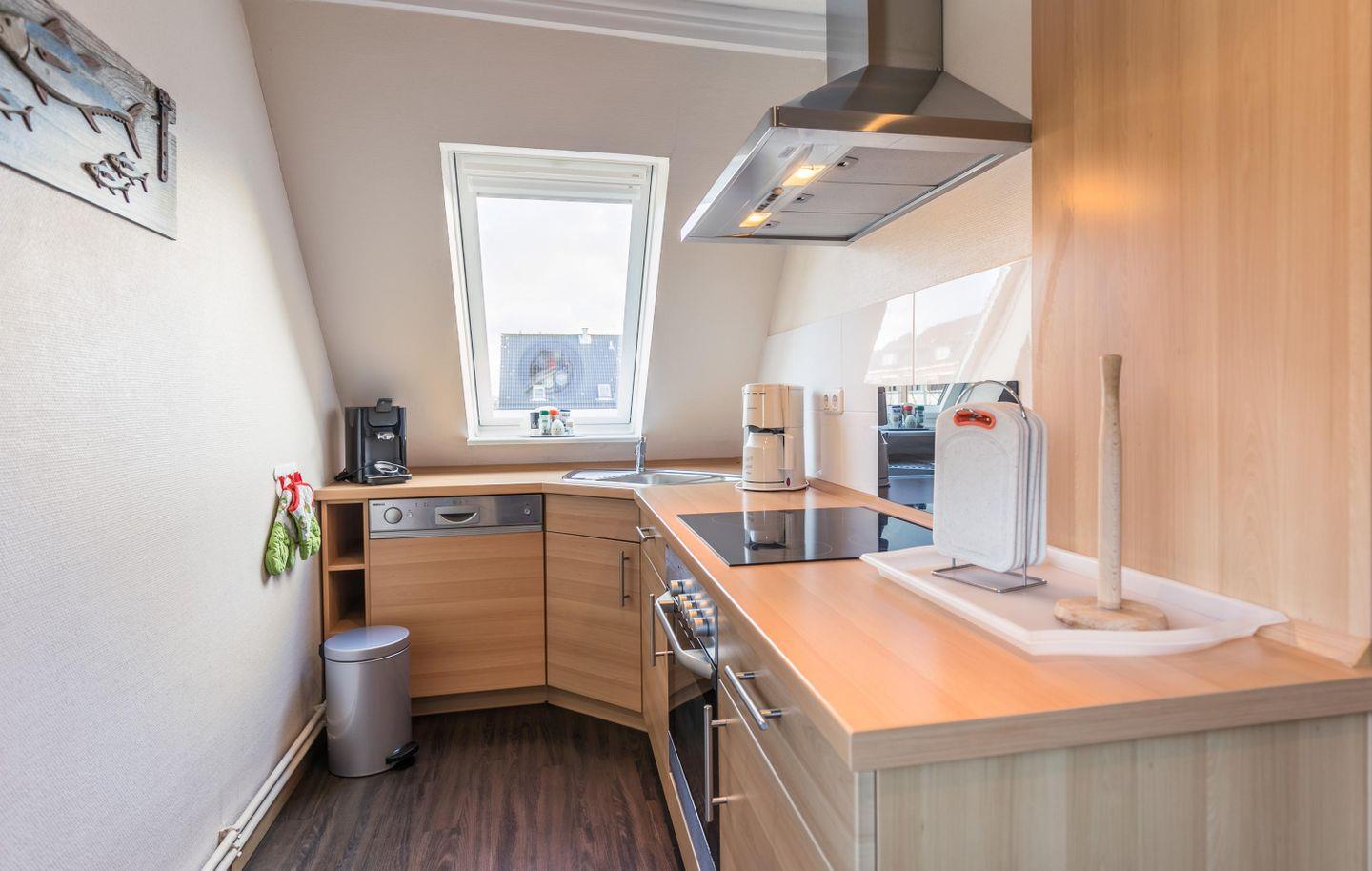 Backofen, Koch-Ceranfeld, Esstisch mit 4 Stühlen, Geschirrspüler, Eierkocher, Kaffeemaschine, Radio, Kühlschrank mit Gefrierfach, Toaster, Wasserkocher, Radio