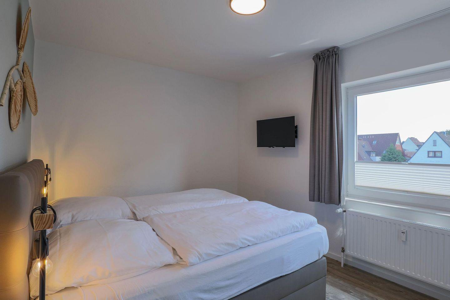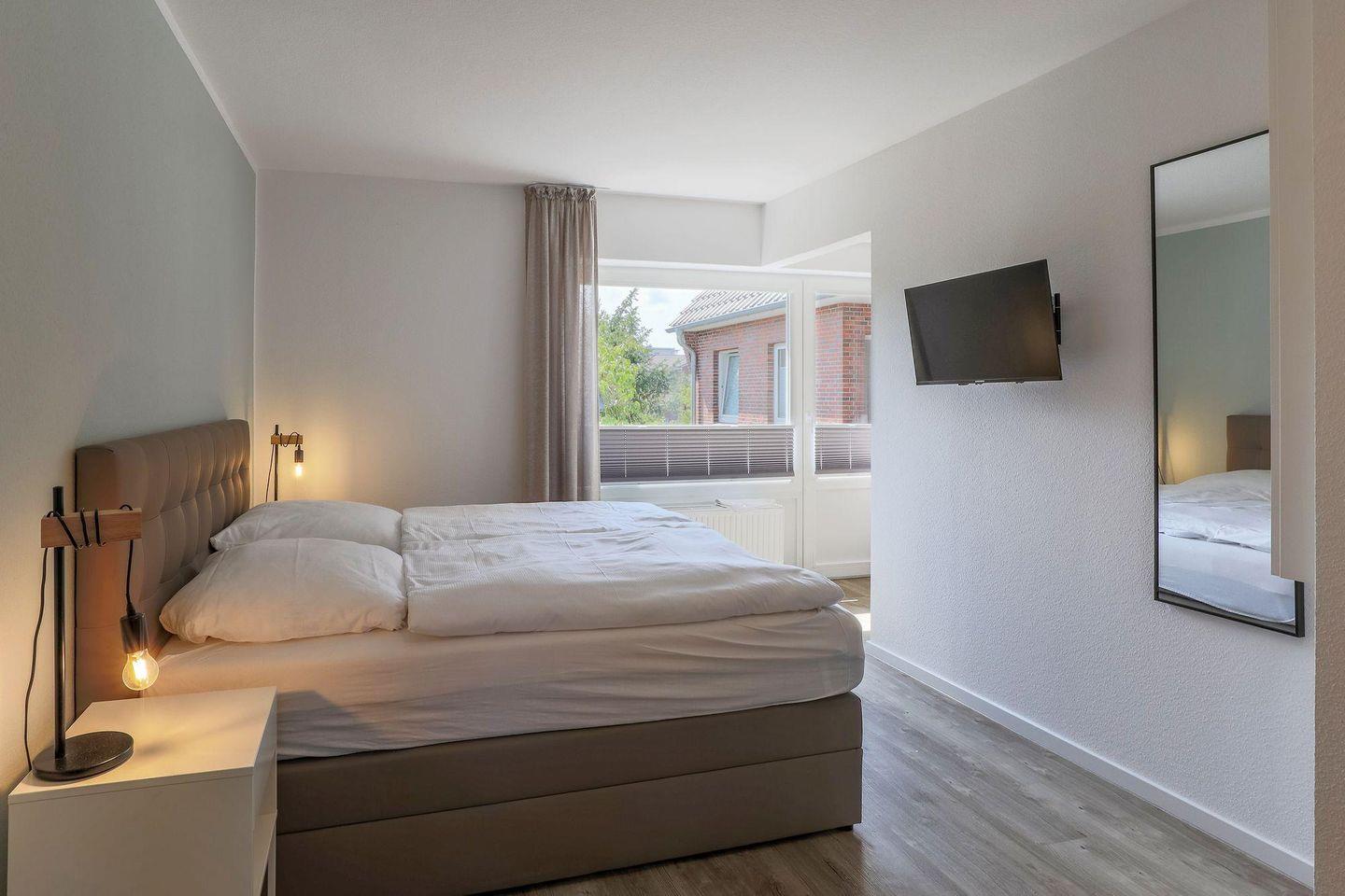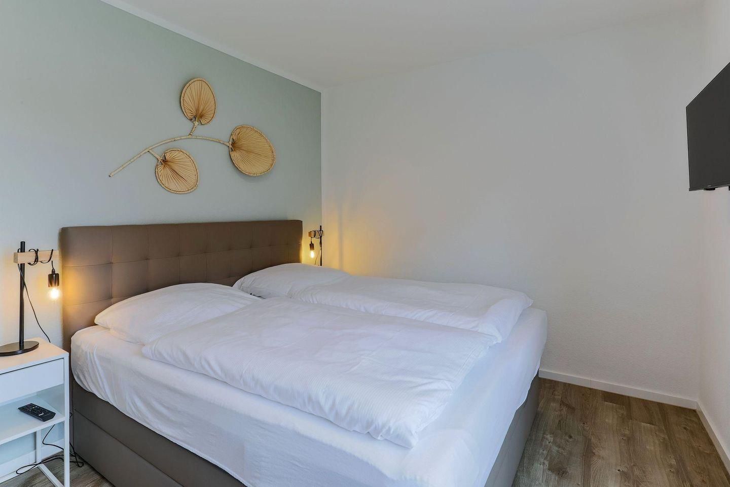 Ein heller Flur empfängt Sie mit einer modernen Garderobe und Zugängen zu sämtlichen Zimmern. Die Ferienwohnung bietet mit 2 Schlafzimmern Platz für 4 Personen. Das Hauptschlafzimmer bietet ein Duschbad en Suite und einen Zugang zum sonnigen Südbalkon. Beide Schlafzimmer sind mit einem hochwertigen Doppel-Boxspringbett (180 x 200) ausgestattet. Die Betten verfügen über Bettkästen, sodass Sie Ihre Koffer für die Urlaubszeit verstauen können. In beiden Schlafzimmern befinden sich wandhängende TV-Flatscreens für den individuellen Fernsehgenuss.