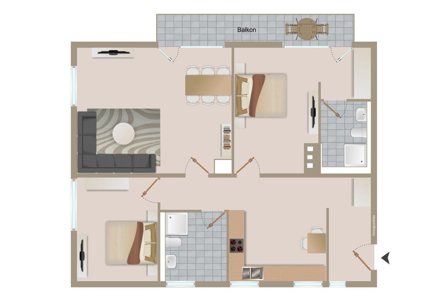 Ein weiteres Tageslichtbad bietet eine große komfortable Dusche mit niedrigem Einstieg sowie eine Handtuchheizung. Eine moderne, separate und offene Küche bietet ebenfalls einen Essplatz sowie eine Spülmaschine, ein Cerankochfeld, eine Filterkaffeemaschine und einen Kühlschrank, der mit einem Gefrierfach versehen ist. Das Herzstück der Wohnung ist das gemütliche Wohnzimmer. Ein schöner Essbereich, eine kuschelige Couchgarnitur und ein großer TV-Flatscreen vervollständigen den Wohnbereich. Auch von hier gelangen Sie auf den großzügigen, sonnigen Südbalkon, der mit hochwertigen Balkonmöbeln ausgestattet ist. Hier können Sie bei einem Glas Wein entspannte Abende mit Ihren Liebsten genießen.