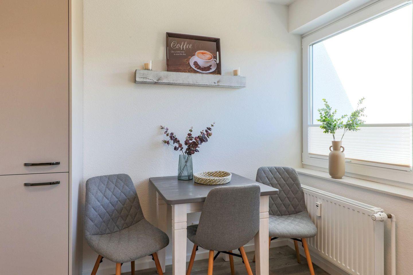 Vom eigenen Stellplatz geht‘s direkt in den Eingangsbereich des Apartmenthauses "Haus Treibholz". Hier bringt Sie ein Fahrstuhl zu der im 1. Stock gelegenen Ferienwohnung. Die 2021 neu sanierte Wohnung bietet mit liebevoll ausgestatteter Einrichtung einen hohen Wohlfühlcharakter.