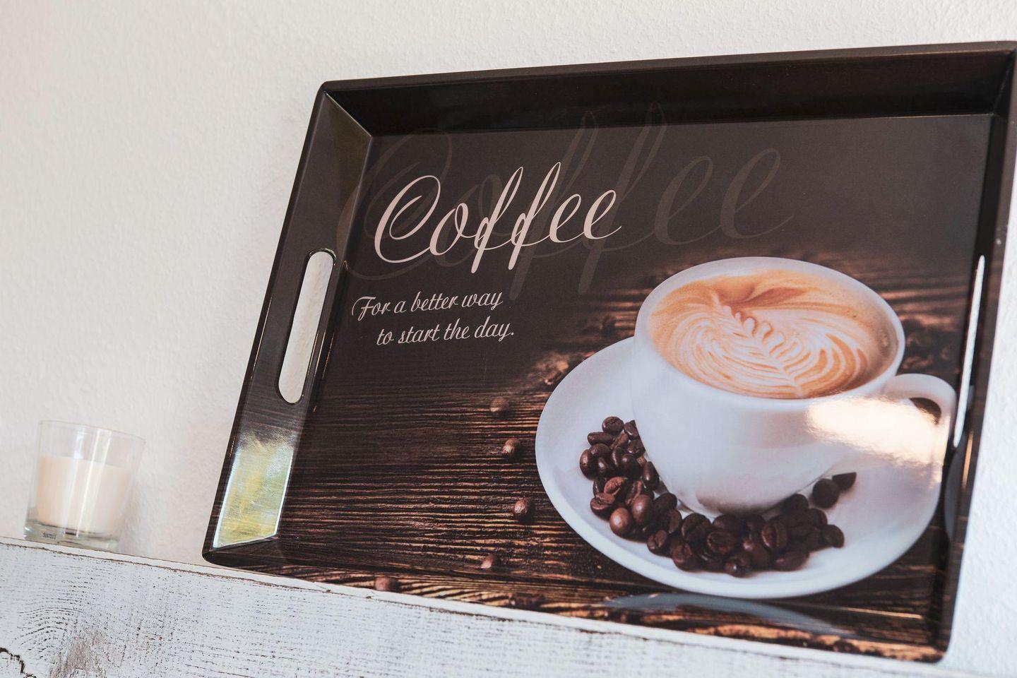 Küchenzeile: Cerankochfeld, Geschirrspüler, Kühlschrank mit Gefrierfach, Filterkaffee, Wasserkocher, Toaster