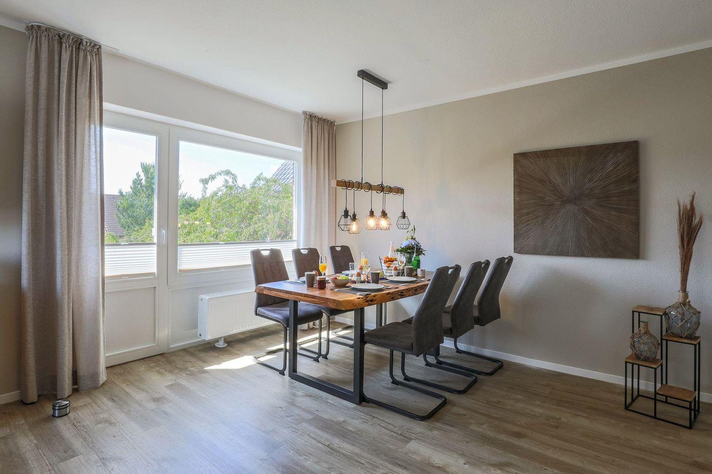 Haus Treibholz Apartment 8 in Büsum bietet auf 100 m² modernen Komfort für bis zu vier Personen. Zwei Schlafzimmer, ein offener Wohn- und Essbereich mit voll ausgestatteter Küche, zwei Bäder sowie ein Balkon sorgen für angenehme Aufenthalte. Ein Privatparkplatz, WLAN, Fahrstuhl und zahlreiche Freizeitmöglichkeiten stehen zur Verfügung.