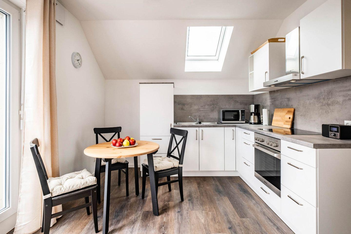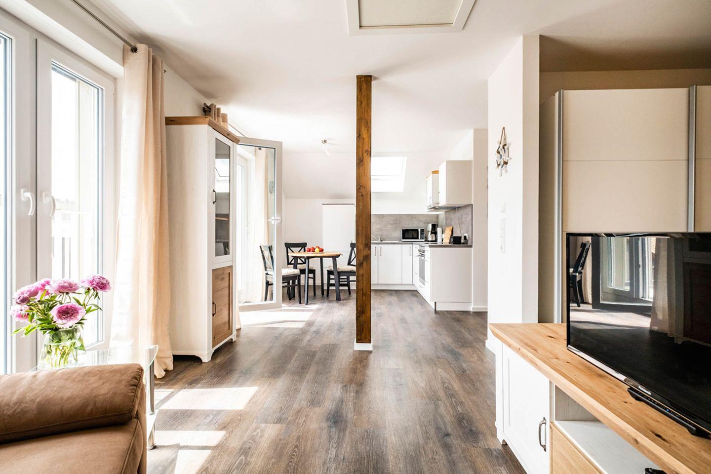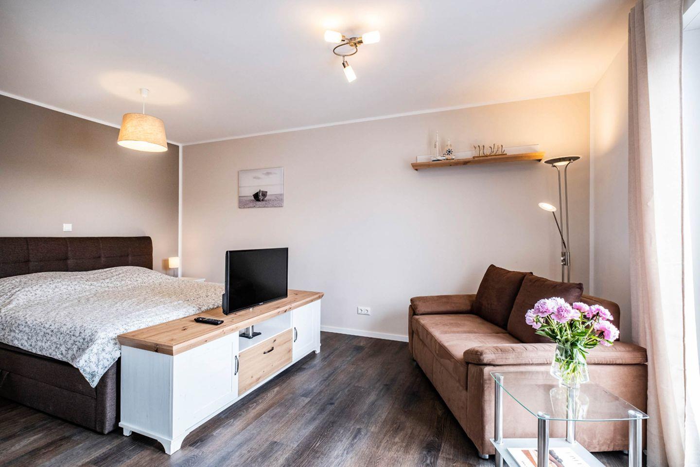 Aufgeteilt ist das Apartment in einen Wohn- und Essbereich (offene Küche) mit angrenzendem Schlafbereich. Der Fernseher im Wohnbereich auf dem Sideboard lässt sich wenden, sodass Sie abends bequem vom Doppelbett Ihre Lieblingsserie schauen können. Von dem Wohnbereich gelangen Sie auf den kleinen Balkon. Die Küche ist mit einem Herd, Backofen und einer Mikrowelle ausgestattet. Das Tageslichtbad verfügt über eine bodengleiche Dusche und einen Handtuchheizkörper.