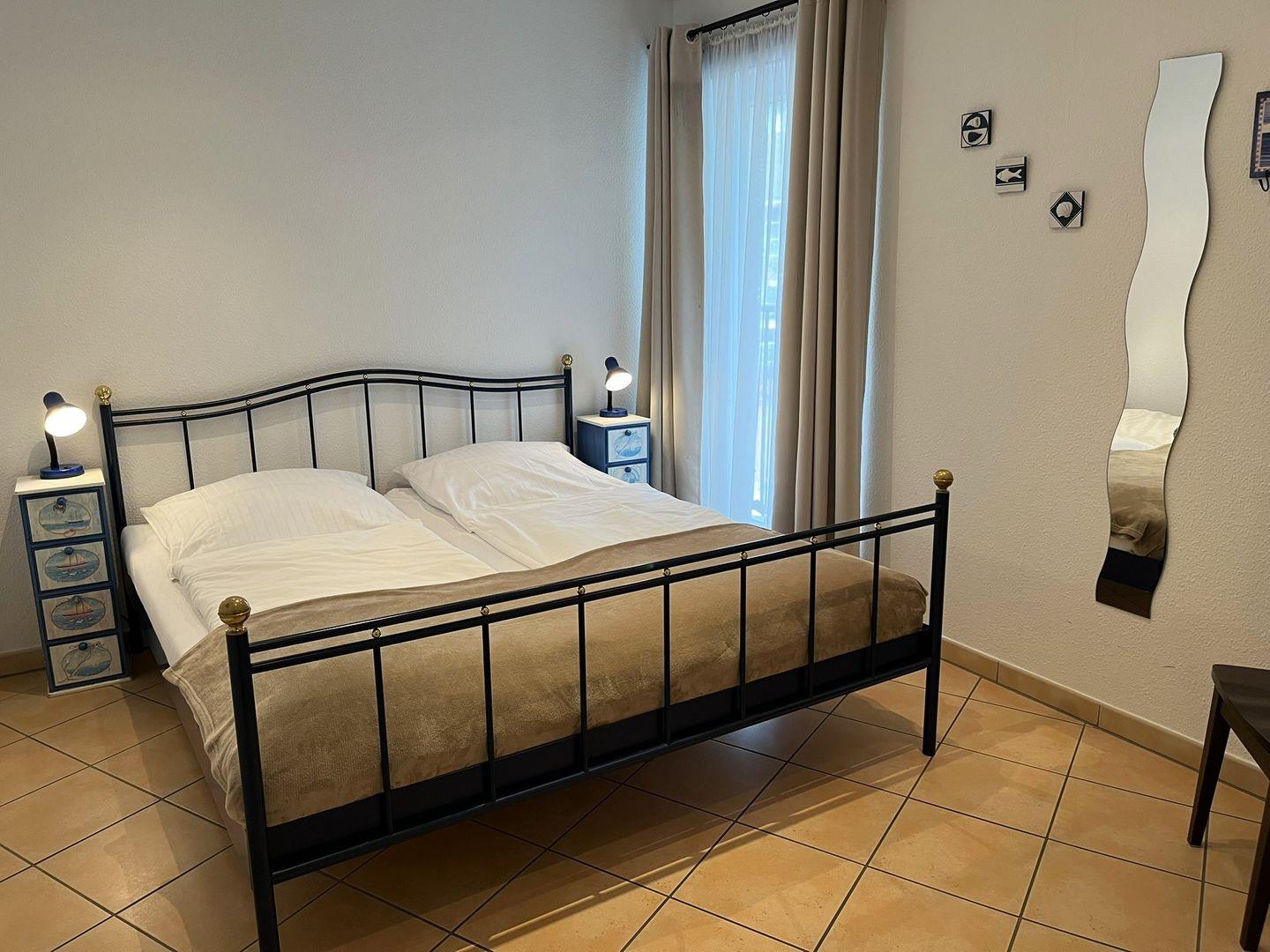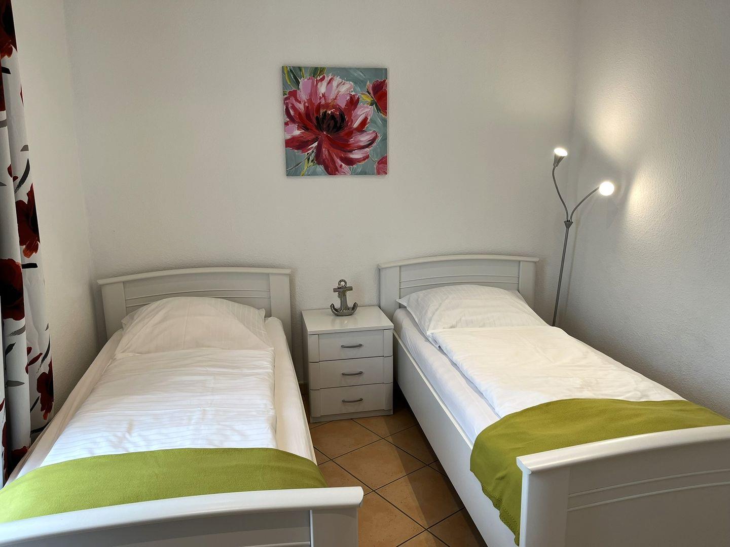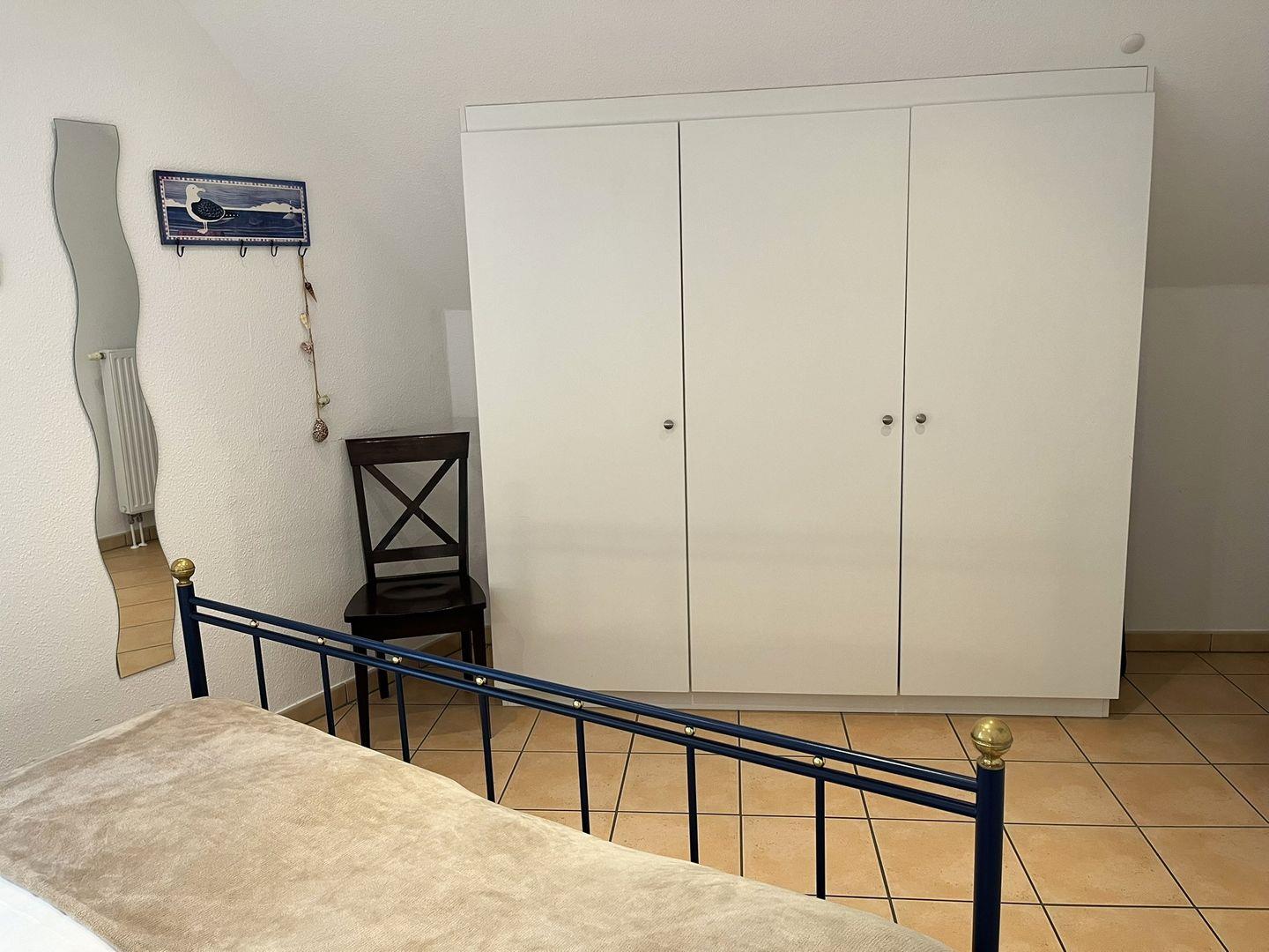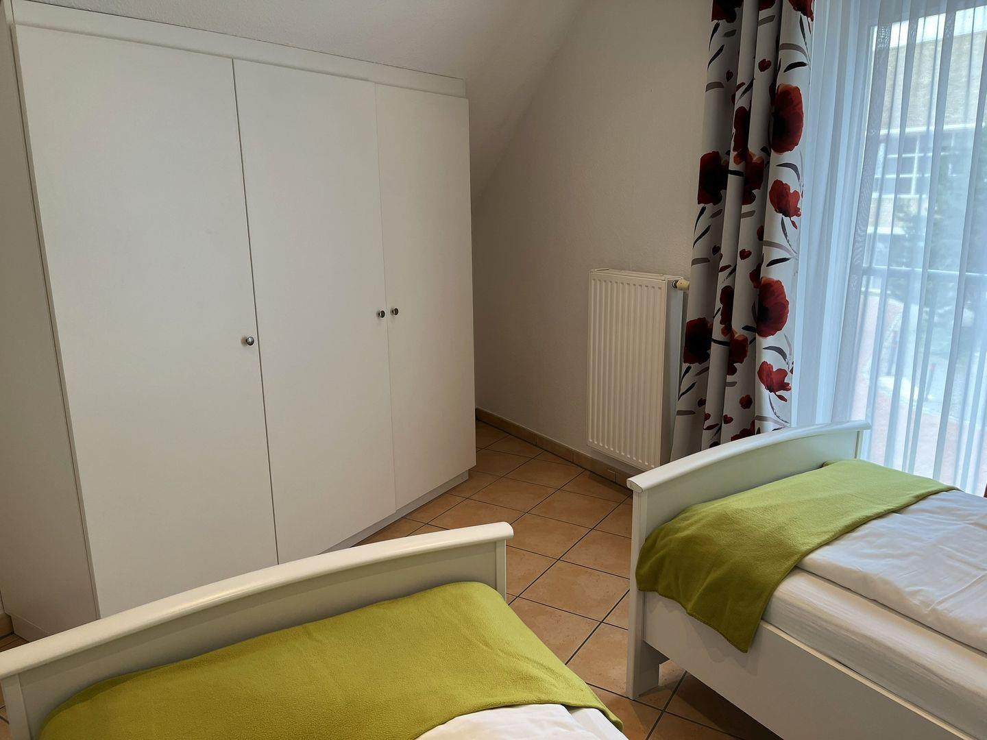 Es befinden sich 2 Schlafzimmer in dieser Wohnung. Eines mit einem Doppelbett und das andere mit 2 Einzelbetten, die aber auch zusammen geschoben werden können. Es ist ausreichend Platz für Ihre Urlaubsgarderobe vorhanden.