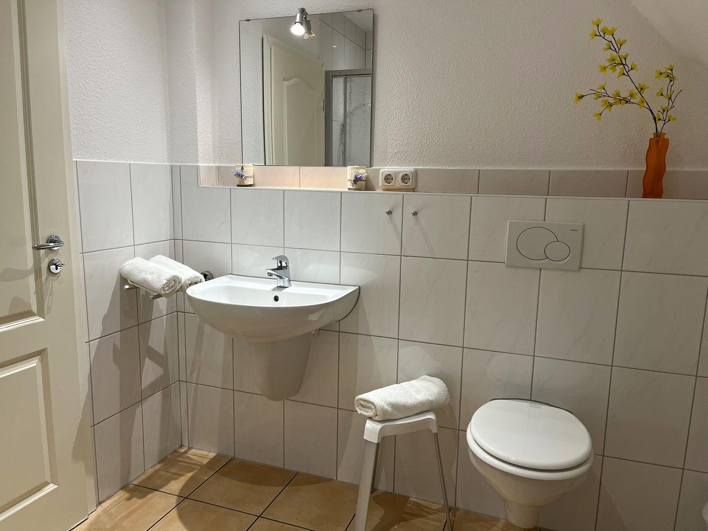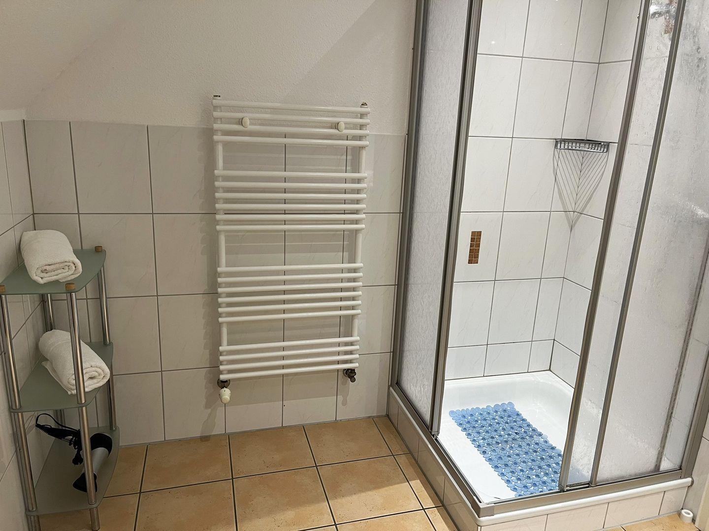 Ein geräumiges Badezimmer mit Dusche und Handtuchwärmer komplettiert diese Haus Sailor Wohnung.
