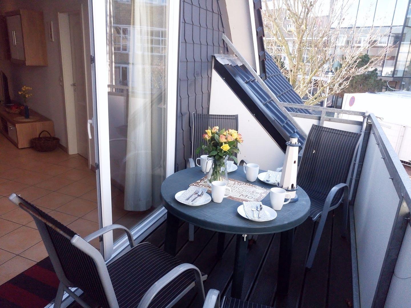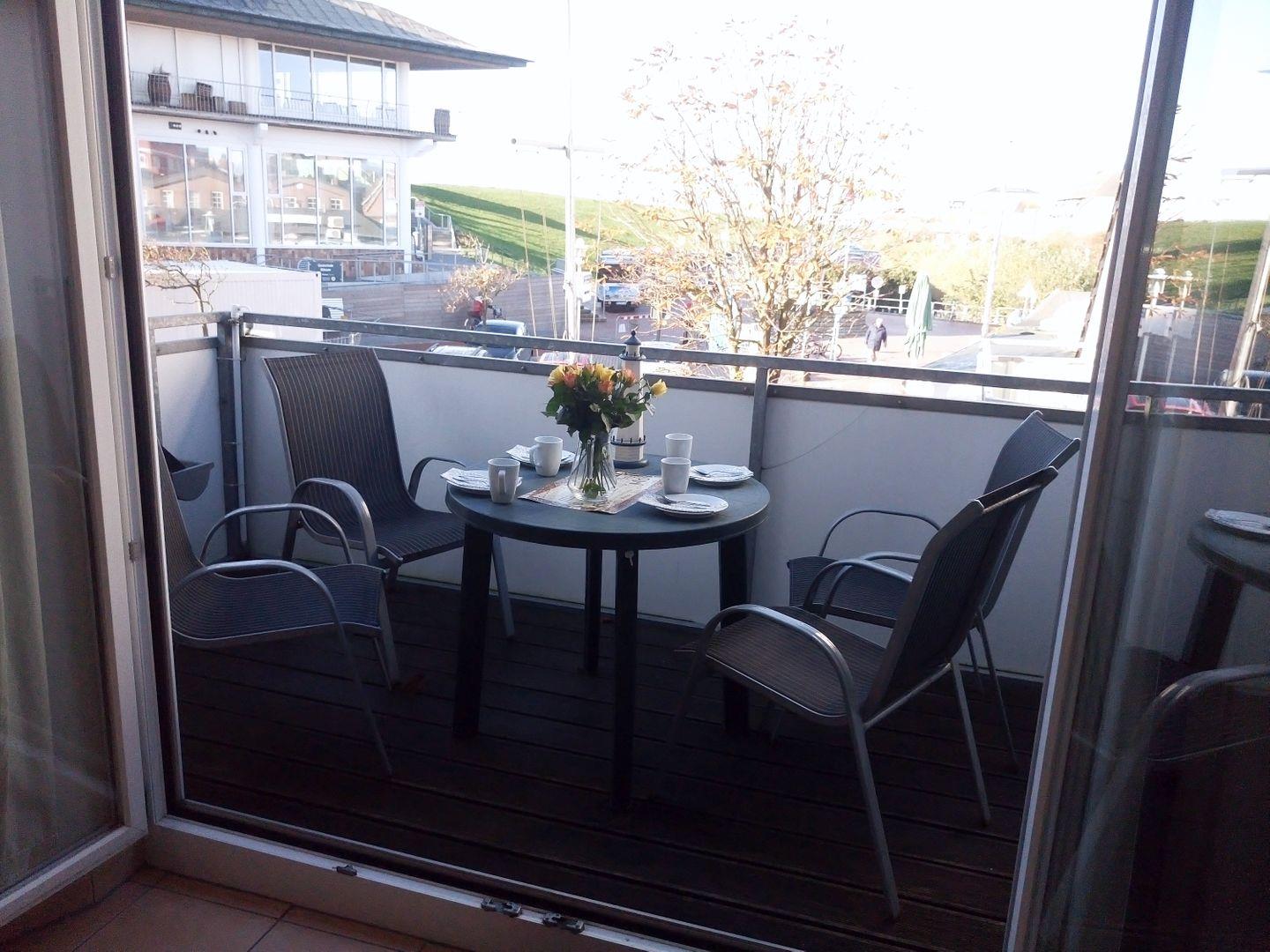 Büsum- Urlaub in bester Lage. Hübsche Ferienwohnung mit Balkon in toller Lage direkt am Hauptstrand. In dem Backwaren- Bistro im Erdgeschoss kann man am Morgen herrlich frühstücken.