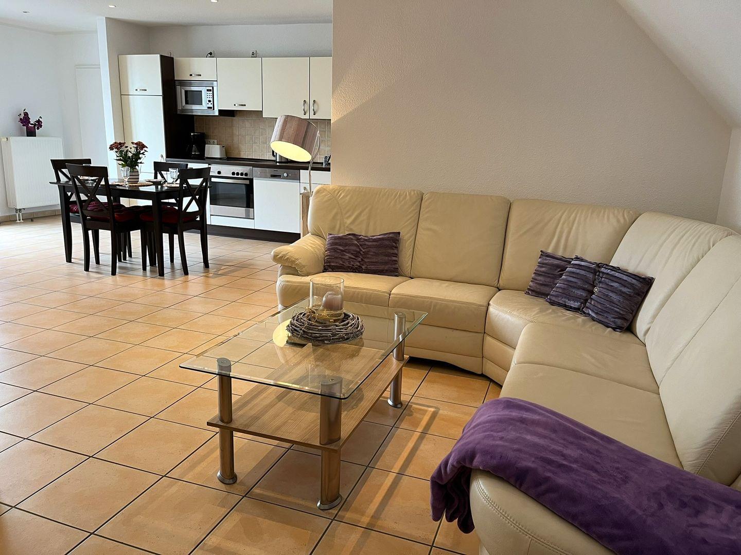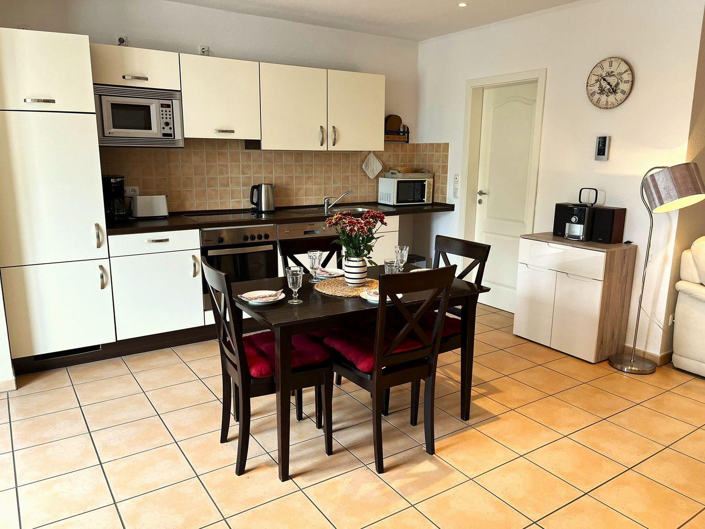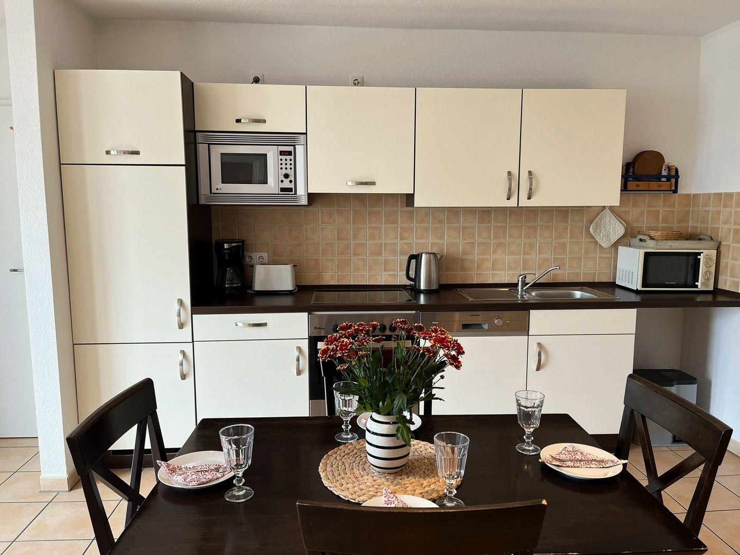 Der kombinierte Wohn- Essbereich schließt an den Balkon an, hier können Sie sich entspannen. Die Küchenzeile im Wohnraum ist komplett eingerichtet, so dass Sie sich Ihre Mahlzeiten auch bequem selber zubereiten können.