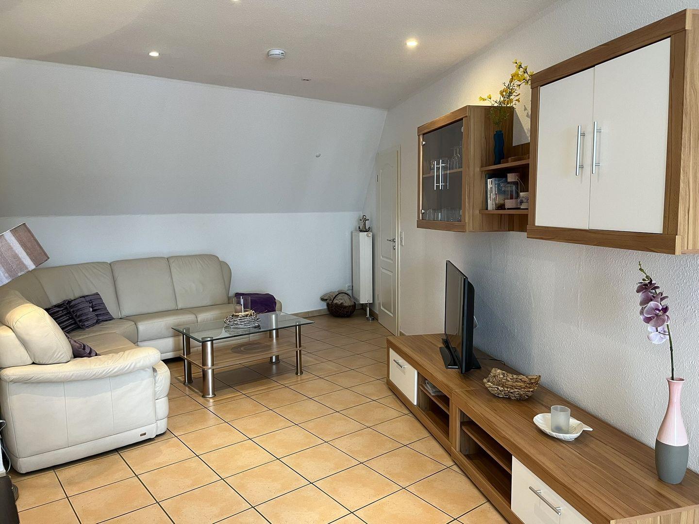 Die helle 3-Zimmer-Ferienwohnung im 1ten Obergeschoss (bei Einschränkungen bzw. Behinderungen ist die Treppe nicht zu empfehlen) ist für bis zu 4 Personen ausgestattet und punktet durch die Großzügigkeit der Räume. Vom Balkon aus können Sie den herrlichen Deichblick und das bunte Treiben genießen.