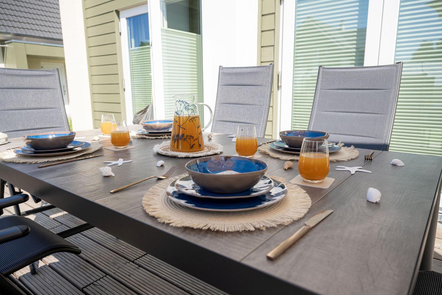 Die vollmöblierte Terrasse lässt sich nicht nur zum Sonnenbaden oder lieber im Schatten des Sonnenschirms, sondern auch für laue Sommerabende am modernen Elektrogrill perfekt nutzen.