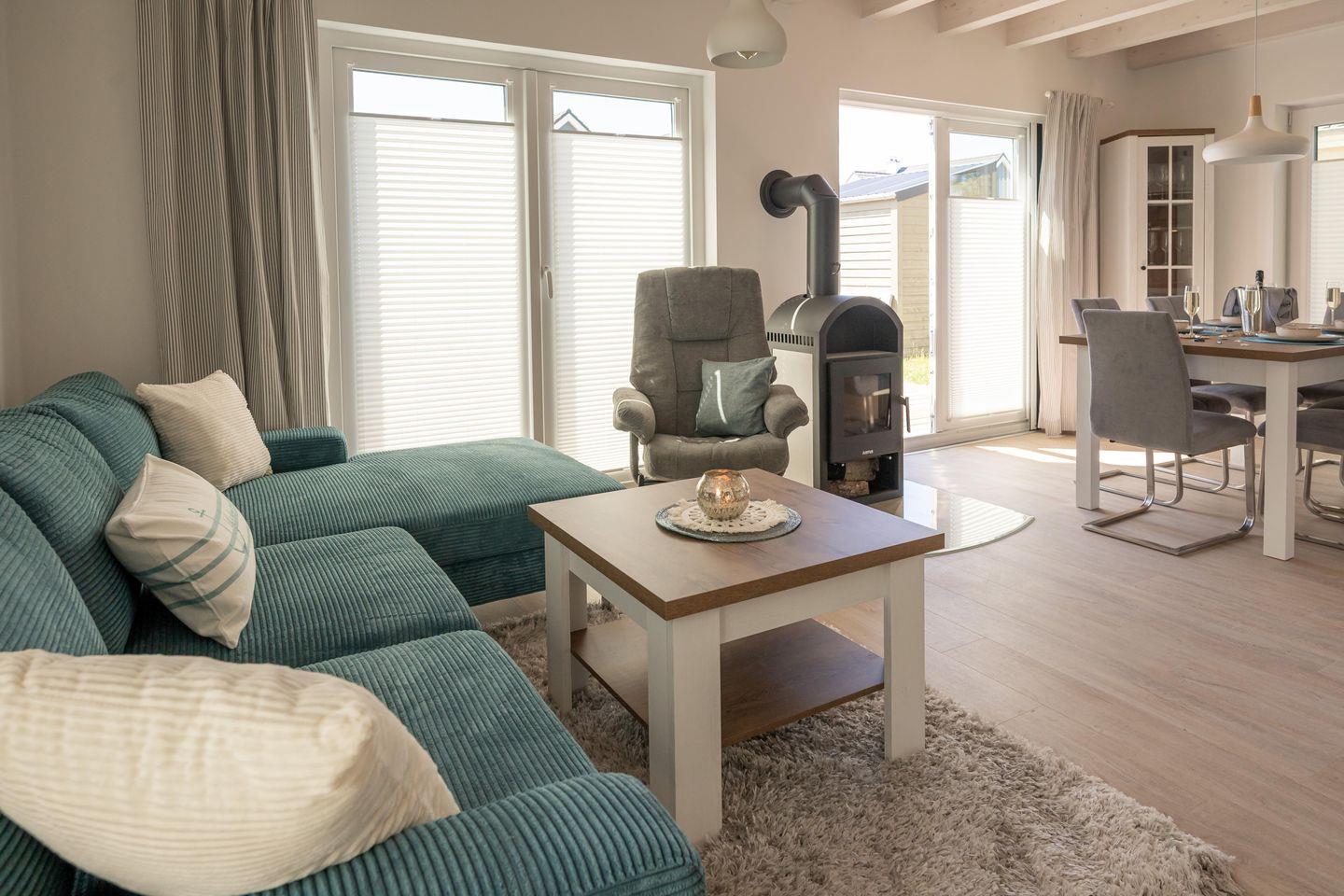Nach stürmischen Strandspaziergängen kann es sich die ganze Familie vor dem Kamin auf der großen Couch bequem machen.