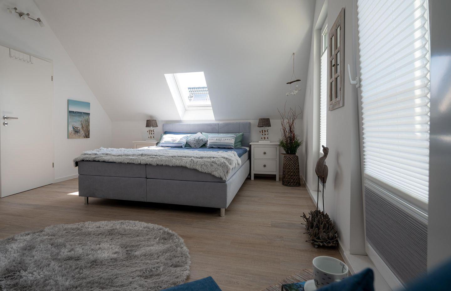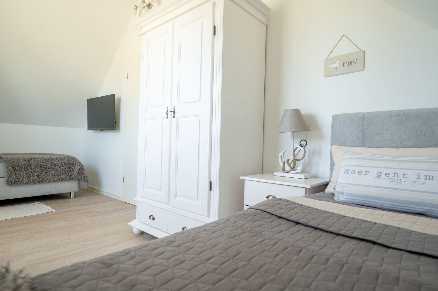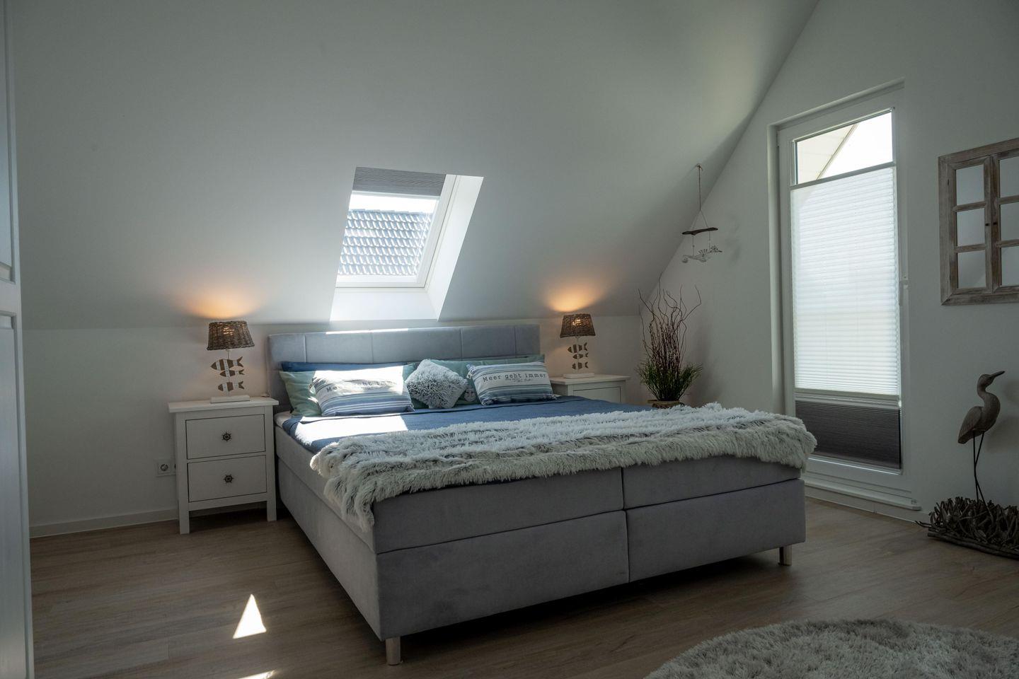 Das im Erdgeschoss gelegene Schlafzimmer lädt in einem Doppel-Boxspringbett (1,80 x 2,00 m ) zu einer angenehmen Nachtruhe ein. Im Obergeschoss finden Sie die zwei weiteren Schlafzimmer. Eins ausgestattet mit einem Doppel-Boxspringbett (1,80 x 2,20 m) und einem zusätzlichen Schlafsessel das Zweite mit zwei Einzel-Boxspringbetten (90 x 2,00 m ). Alle Schlafzimmer sind mit Verdunkelungsplissee's ausgestattet und die beiden Schlafzimmer im OG verfügen noch über einen Flachbild-TV.