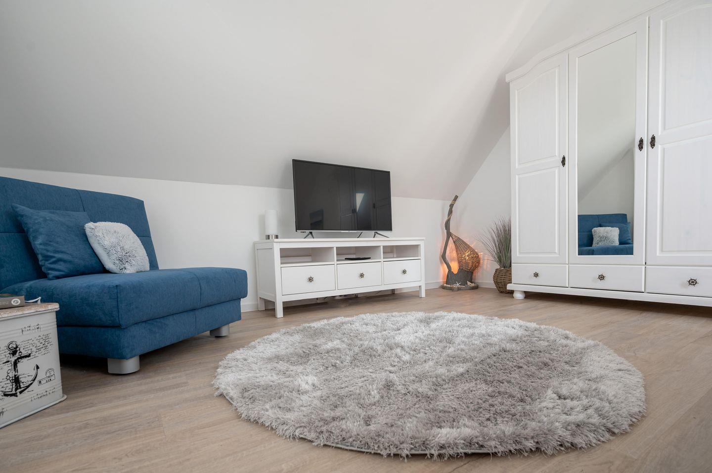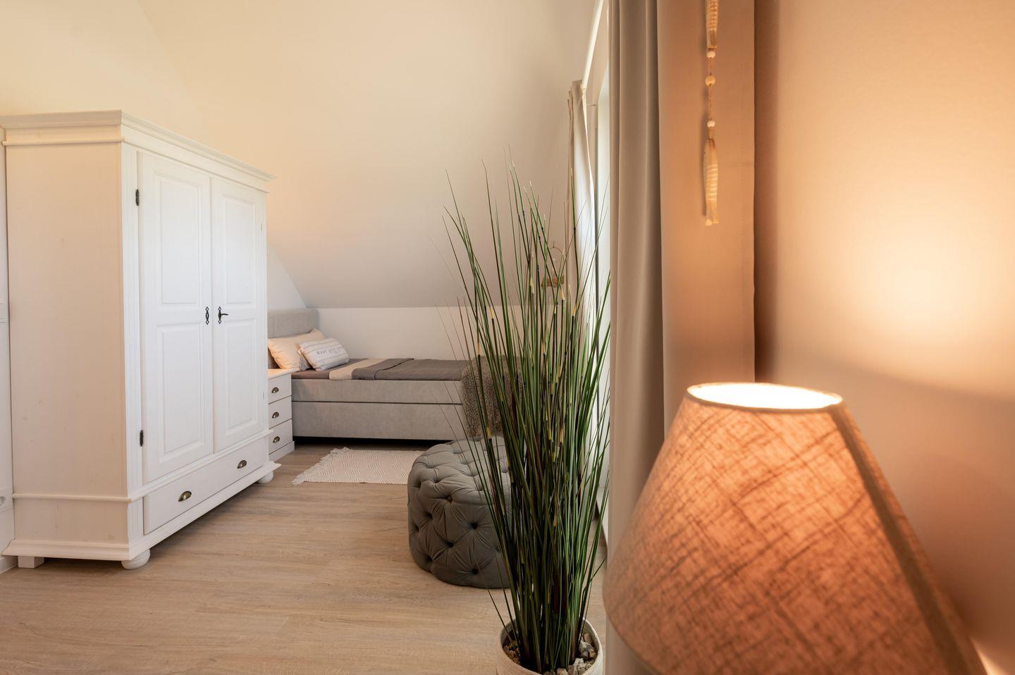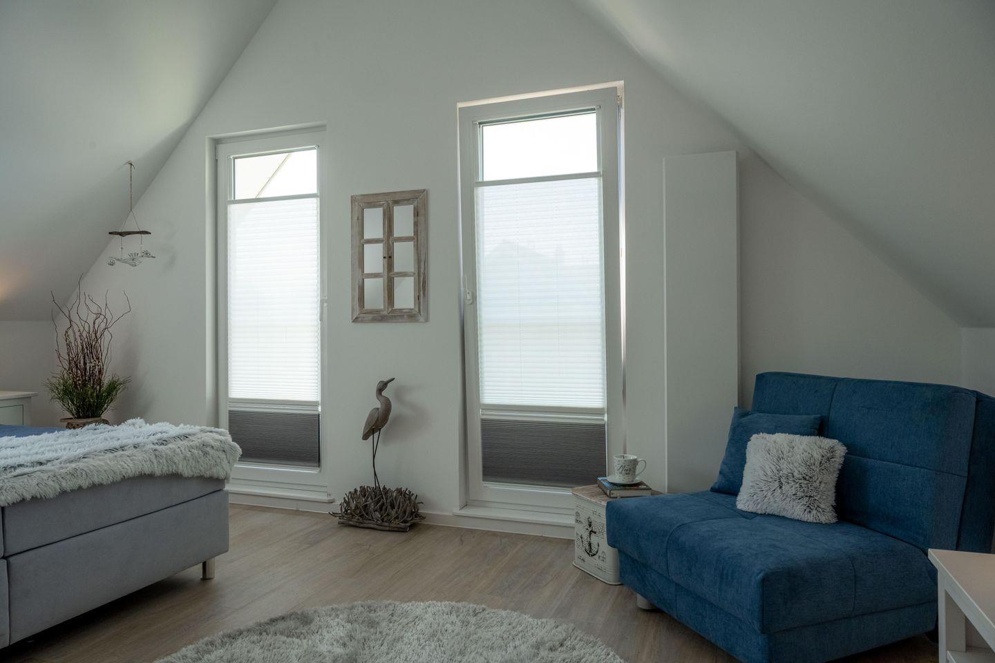 Das im Erdgeschoss gelegene Schlafzimmer lädt in einem Doppel-Boxspringbett (1,80 x 2,00 m ) zu einer angenehmen Nachtruhe ein. Im Obergeschoss finden Sie die zwei weiteren Schlafzimmer. Eins ausgestattet mit einem Doppel-Boxspringbett (1,80 x 2,20 m) und einem zusätzlichen Schlafsessel das Zweite mit zwei Einzel-Boxspringbetten (90 x 2,00 m ). Alle Schlafzimmer sind mit Verdunkelungsplissee's ausgestattet und die beiden Schlafzimmer im OG verfügen noch über einen Flachbild-TV.