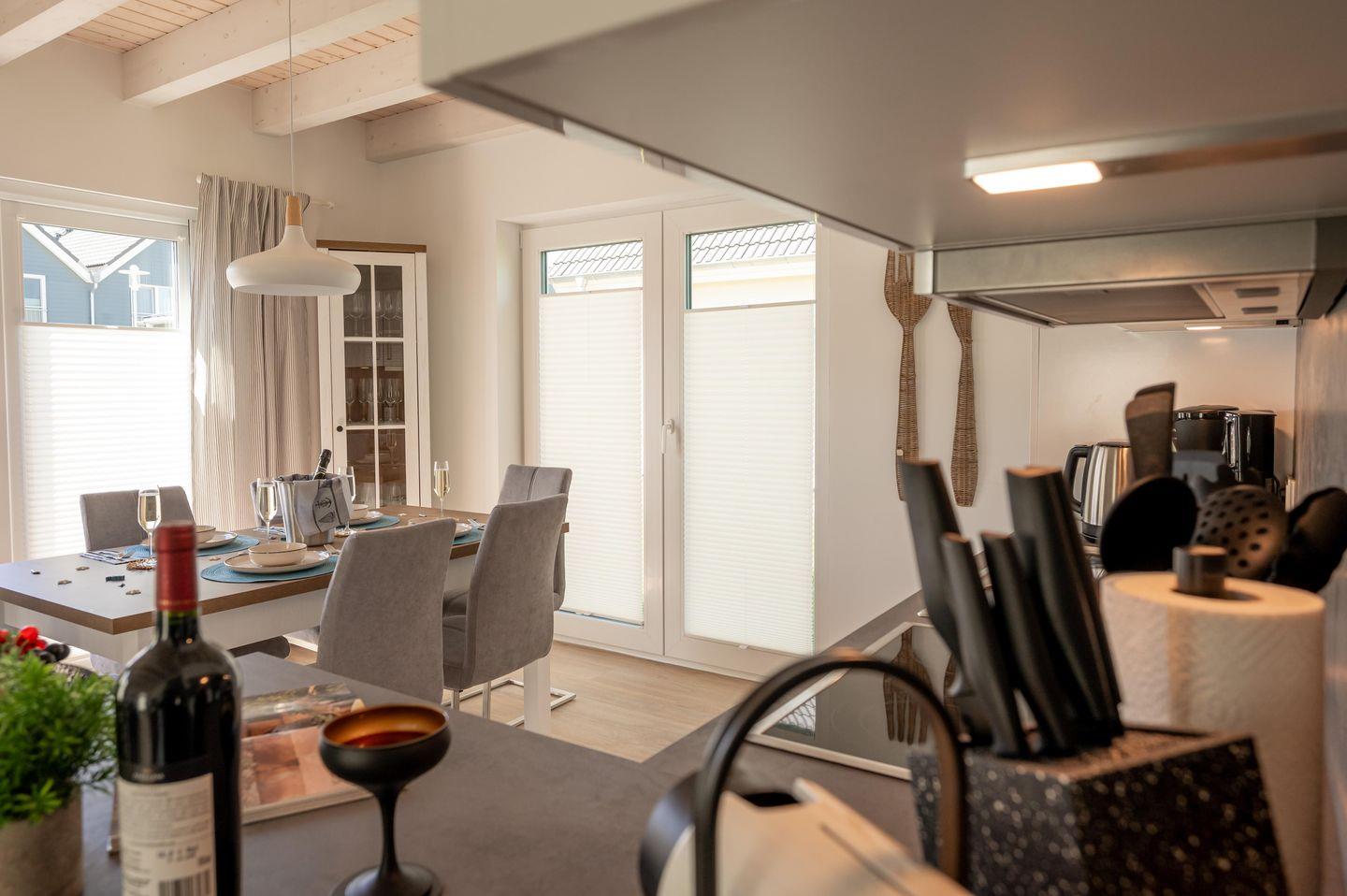 Auf 2 Etagen befinden sich insgesamt 3 Schlafzimmer, 2 Bäder, sowie eine offene Küche mit angrenzendem Wohn- und Essbereich und Kaminofen. Die Schlafzimmer sind mit 2 Doppelbetten, einem Schlafsessel und 2 Einzelbetten ausgestattet. Das Duschbad im EG bietet eine Infrarotsauna, im OG finden Sie ein Wannenbad. Die Terrasse ist vollmöbliert und mit einem Grill ausgestattet. Vor dem Haus befindet sich 2 PKW-Stellplätze und ein abschließbarer Fahrradschuppen.