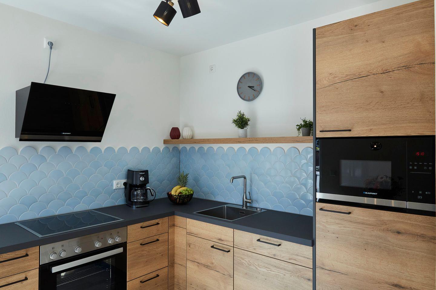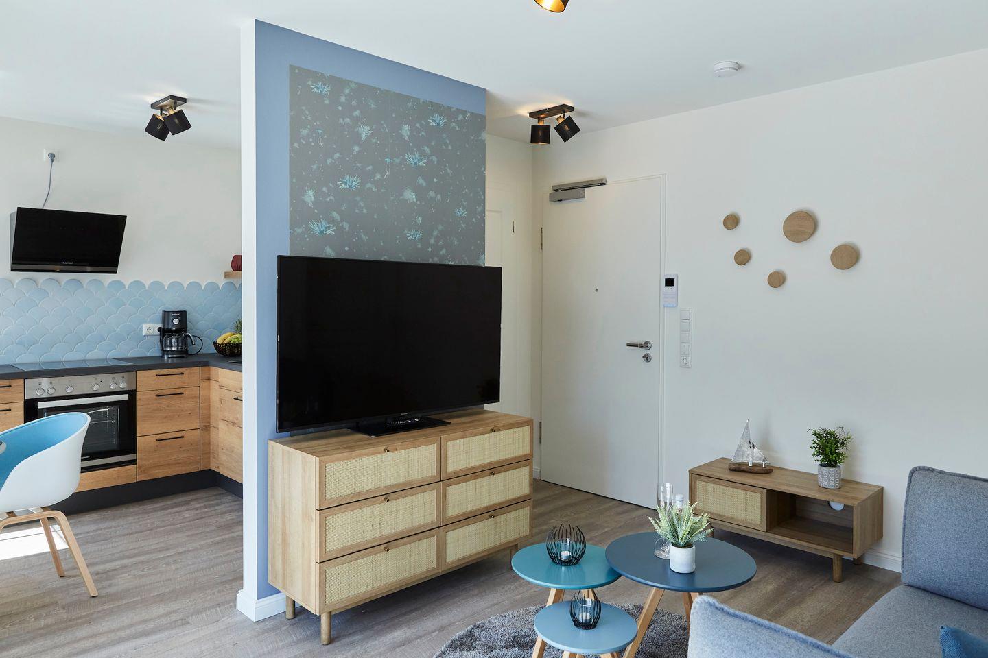 Das Apartment überzeugt durch seine einladende Gestaltung und durchdachte Ausstattung. Der offene Wohnbereich mit einer gemütlichen Sofaecke lädt zum Entspannen ein und ist gleichzeitig der perfekte Ort, um den Tag bei einem Film auf einem der zwei TVs ausklingen zu lassen. Der Essbereich, der nahtlos in den Wohnbereich übergeht, bietet Platz für gemeinsame Mahlzeiten. Die moderne, voll ausgestattete Küche ist ein Highlight: Sie verfügt über einen Cerankochfeld, einen Backofen, eine Spülmaschine sowie einen Kühlschrank mit Gefrierfach, während eine Mikrowelle, ein Toaster, ein Wasserkocher und eine Kaffeemaschine die Zubereitung Ihrer Lieblingsgerichte erleichtern. Auch Geschirr und Küchenutensilien sind vorhanden, sodass Sie sich wie zu Hause fühlen können.