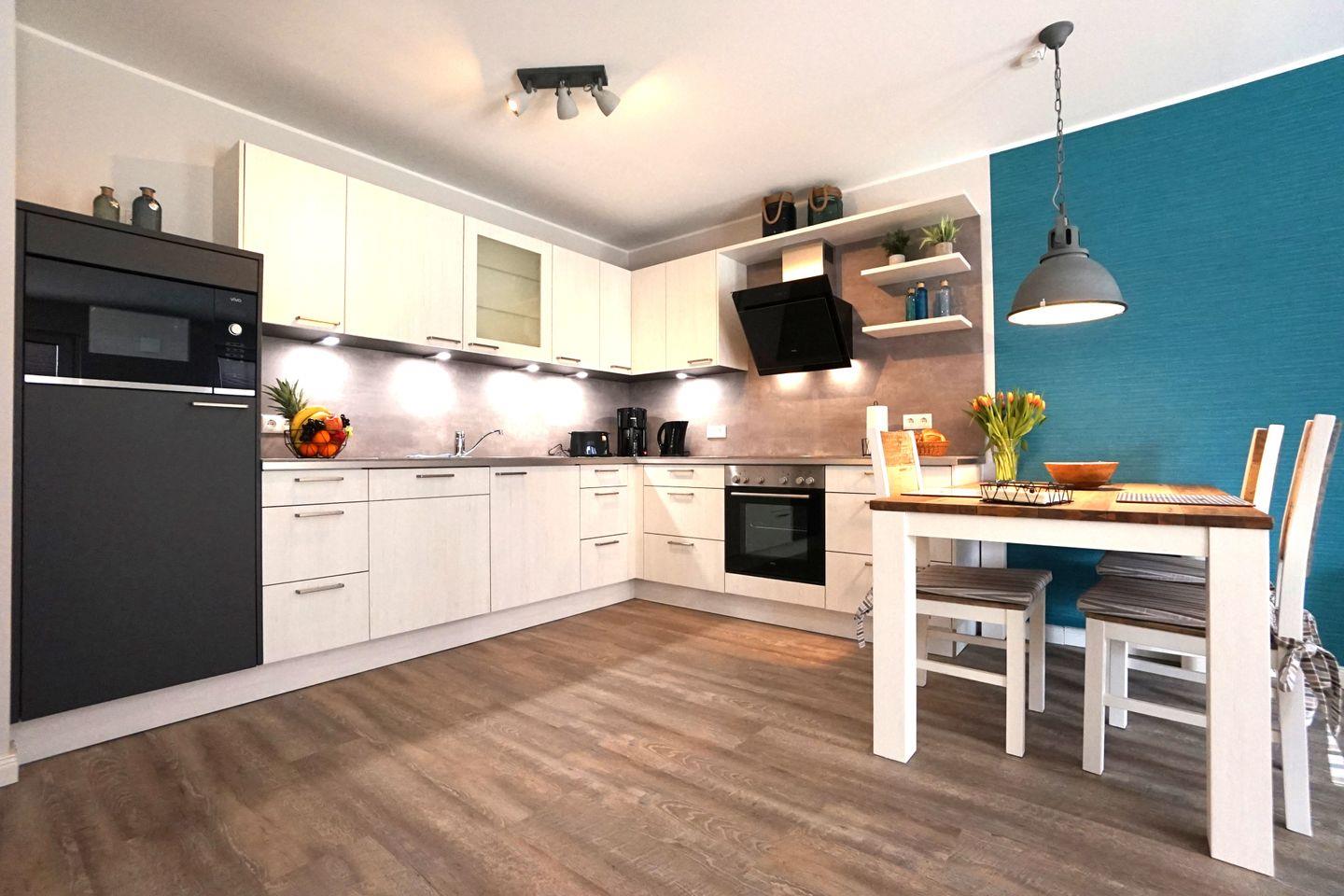 Es erwarten Sie eine Fußbodenheizung, dreifach verglaste Fenster mit elektrischen Außenjalousien, eine moderne Lüftungsanlage, WLAN, ein Bluetooth-Radio, ein Fahrstuhl von der Tiefgarage aus, hochwertige Designer-Möbel, ein Schlafzimmer mit Boxspringbett, Smart-TV im Wohn- und Schlafzimmer, USB-Steckdosen, eine moderne vollausgestattete Küche mit Geschirrspüler und ein großes Badezimmer mit bodentiefer Dusche, Handtuchheizkörper und Föhn.