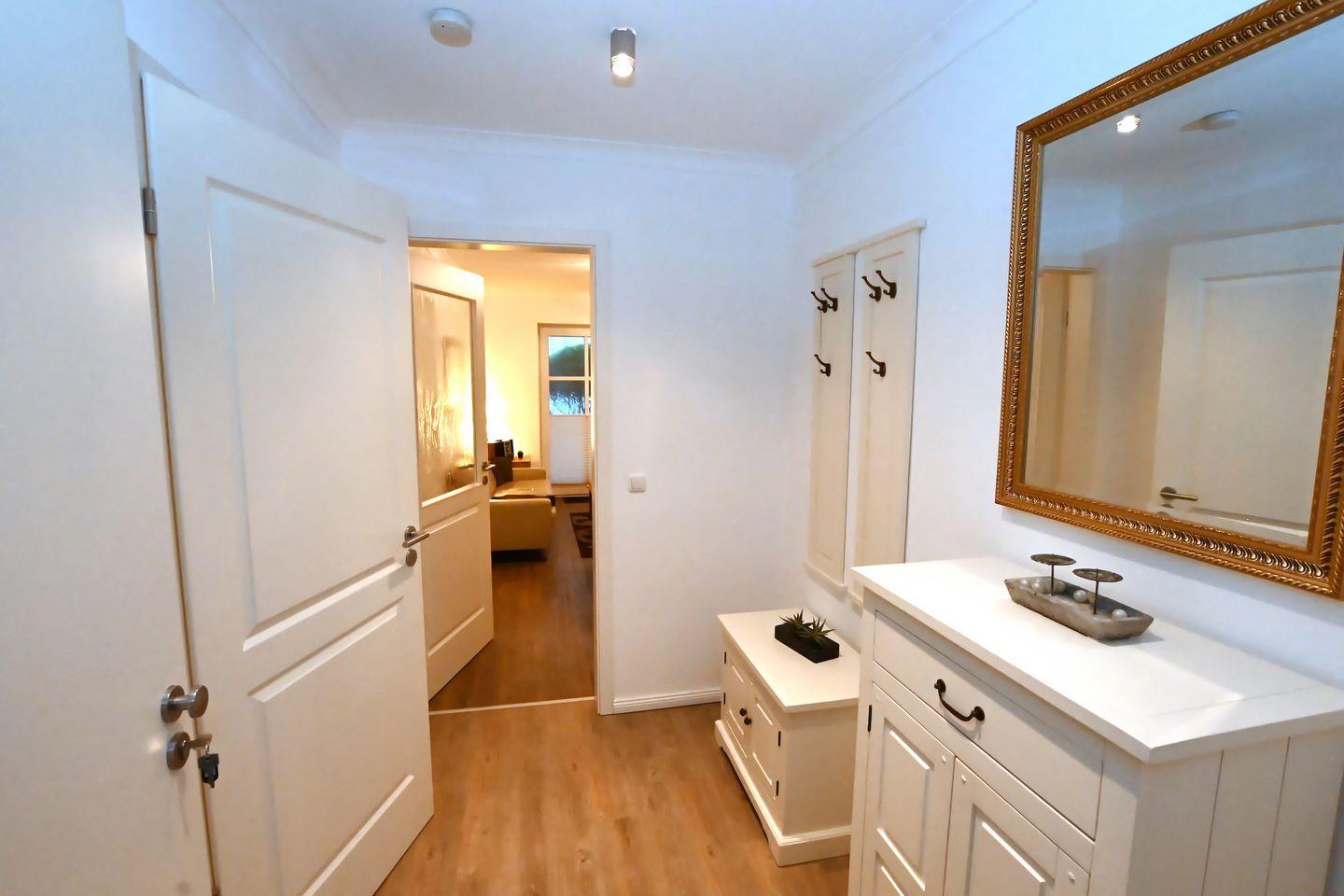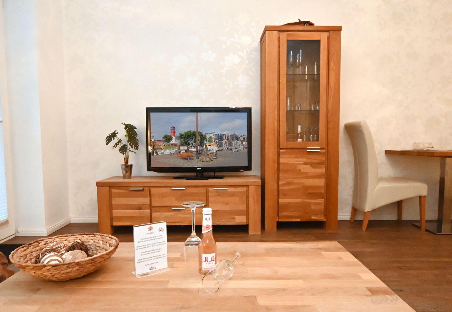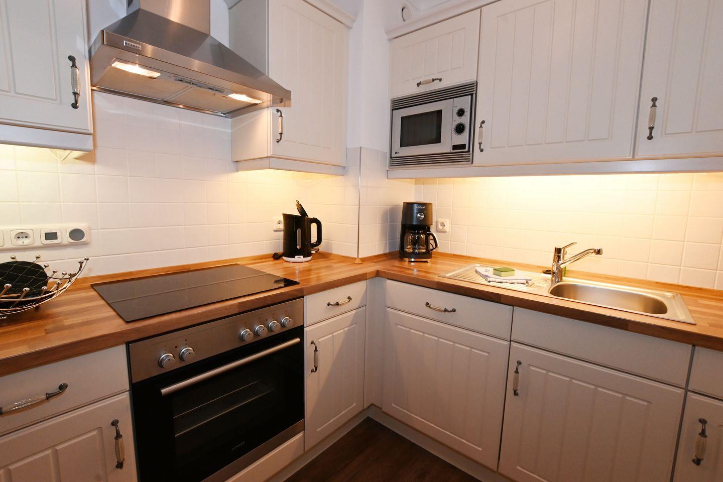 Die Wohnung selbst besticht durch ihren offenen Wohnbereich, der eine einladende Atmosphäre schafft. Der Wohn- und Essbereich ist mit einer Sofaecke, einem Esstisch sowie zwei komfortablen Sesseln ausgestattet, die ideale Rückzugsmöglichkeiten bieten. Die moderne Küche ist offen gestaltet und verfügt über alle nötigen Küchenutensilien. Hier finden Sie eine Mikrowelle, einen Herd, einen Backofen, eine Spülmaschine und einen Kühlschrank mit Gefrierfach. Für Kaffeeliebende ist eine Kaffeemaschine sowie ein Wasserkocher vorhanden. Genießen Sie Ihre selbst zubereiteten Speisen und Getränke in der formschönen Küche oder auf der Terrasse, die über Gartenmöbel verfügt und einen Blick ins Freie bietet.