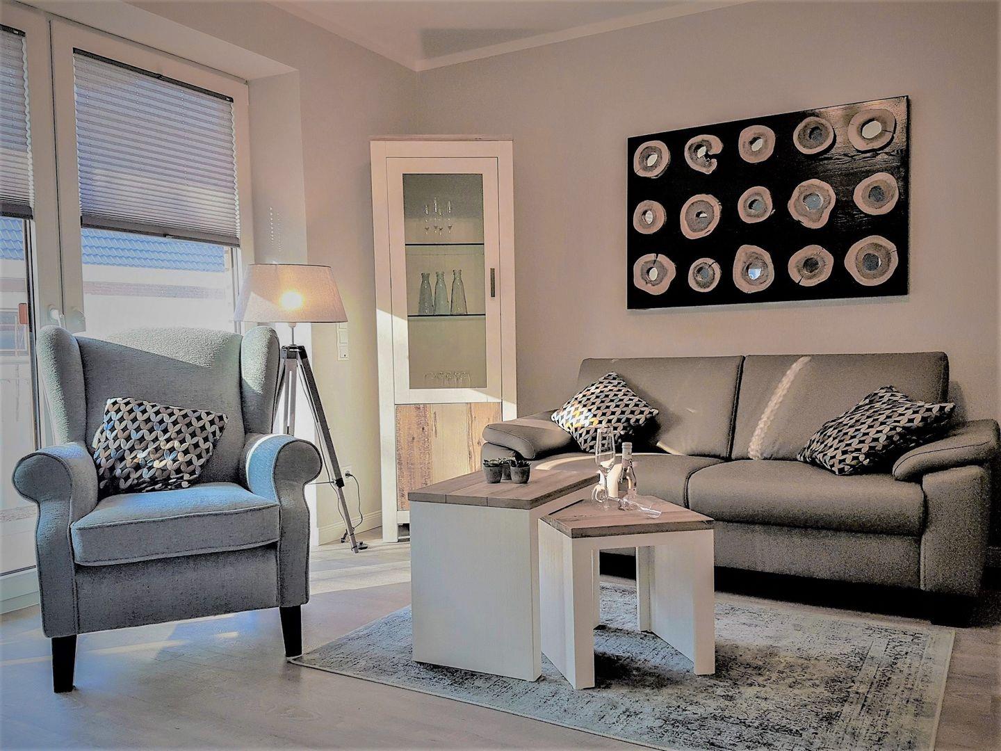 Im zentralen Wohnbereich erwartet Sie eine Sofaecke und ein Esstisch. Zwei Fernseher sowie kostenloses WLAN bieten beste Unterhaltungsmöglichkeiten. Die offen zum Wohnzimmer gestaltete Küche ist vollständig eingerichtet und mit allen wichtigen Geräten ausgestattet: Ihnen stehen unter anderem ein Kühlschrank mit Gefrierfach, ein Backofen, ein Herd, eine Mikrowelle, eine Spülmaschine, eine Kaffeemaschine, ein Toaster und ein Wasserkocher zur Verfügung. Sämtliche Küchenutensilien, Geschirr und Besteck sind vorhanden, sodass Sie nach Belieben kochen können.