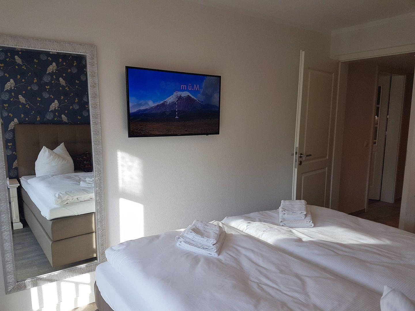 Im Wohnzimmer, sowie im Schlafzimmer befindet sich jeweils ein Smart-TV.