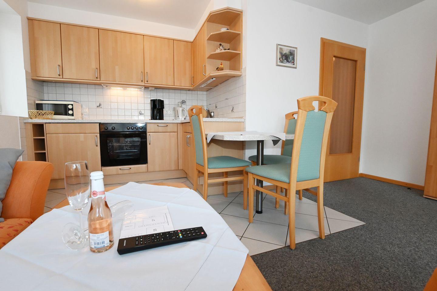 Auf gleicher Ebene befindet sich eine komplett ausgestattete Kochnische sowie ein gemütlicher Essbereich.