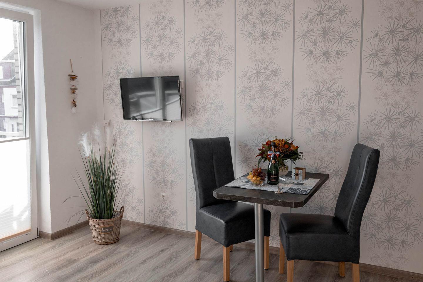 Das modern eingerichtete Apartment verfügt über zwei Zimmer, davon ein separates Schlafzimmer, das mit bequemen Schlafmöglichkeiten ausgestattet ist. Der helle und gemütliche Wohnbereich lädt mit einem Sofa und einem Sessel zum Entspannen ein. Zwei Fernseher sorgen für Unterhaltung und durch das vorhandene WLAN bleiben Sie stets mit dem Internet verbunden. Für angenehme Temperaturen in jeder Jahreszeit steht eine Heizung zur Verfügung.