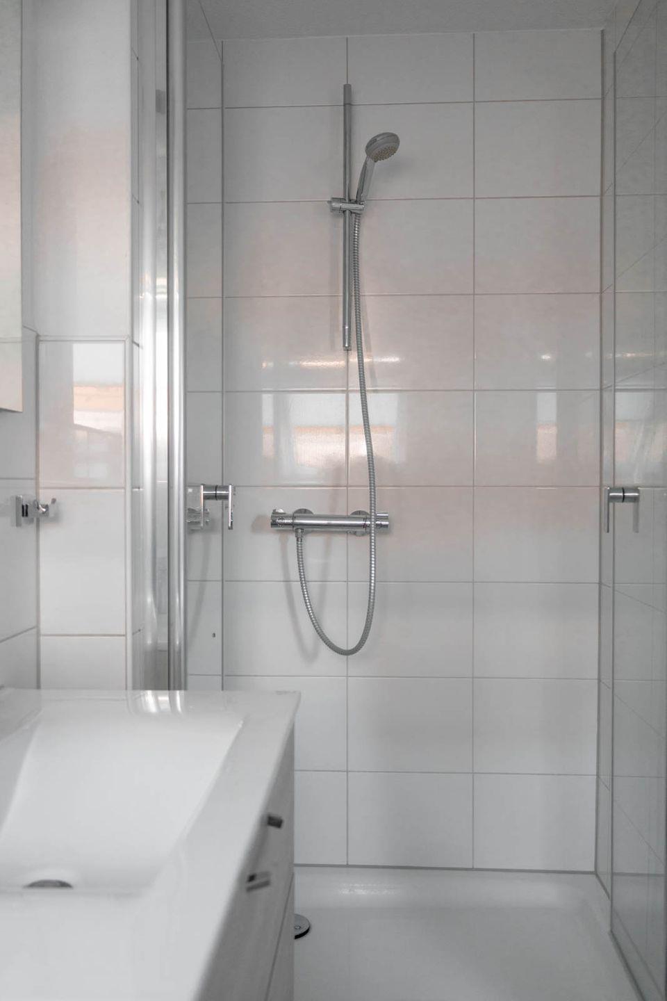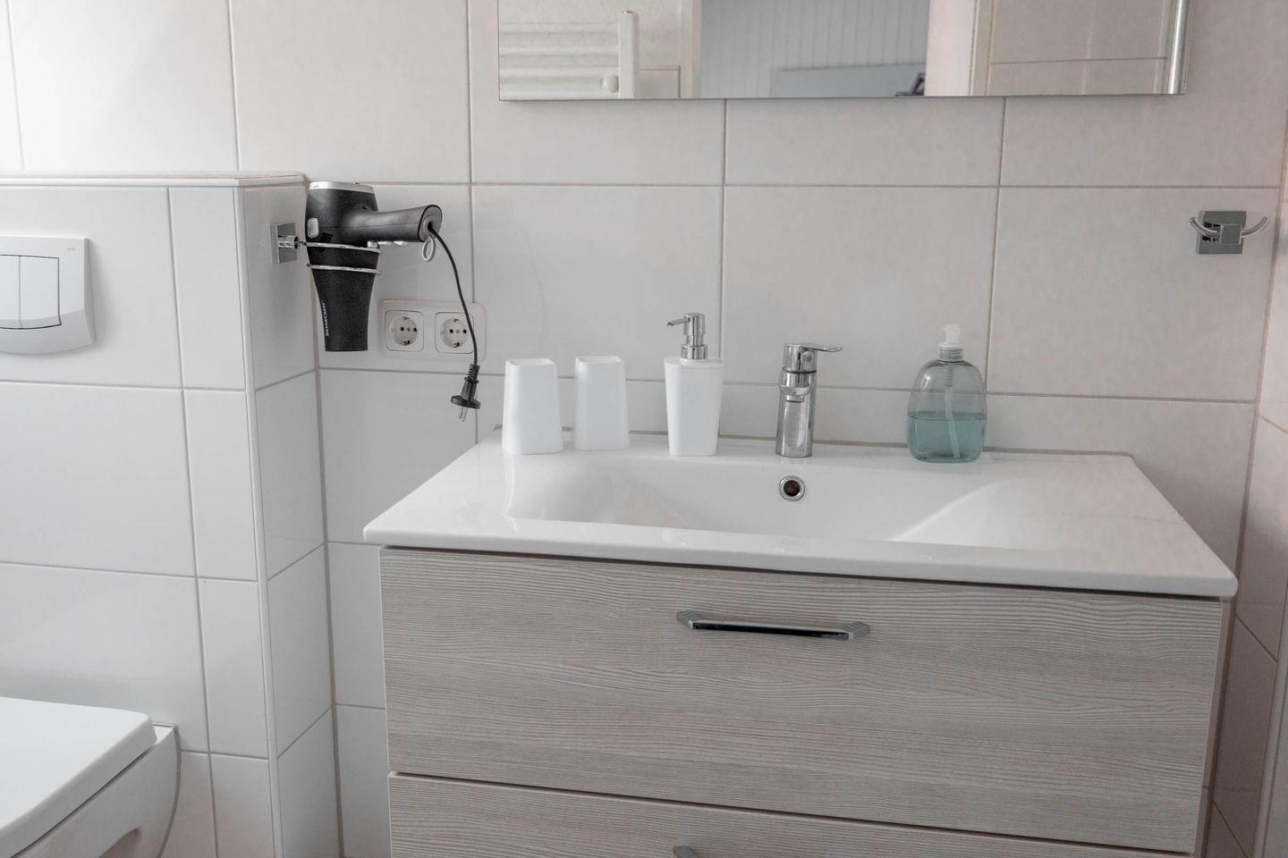 Das Badezimmer präsentiert sich mit einer bodengleichen XL Dusche, WC, Waschbecken, Spiegel und Kosmetikspiegel sowie einem Haartrockner.