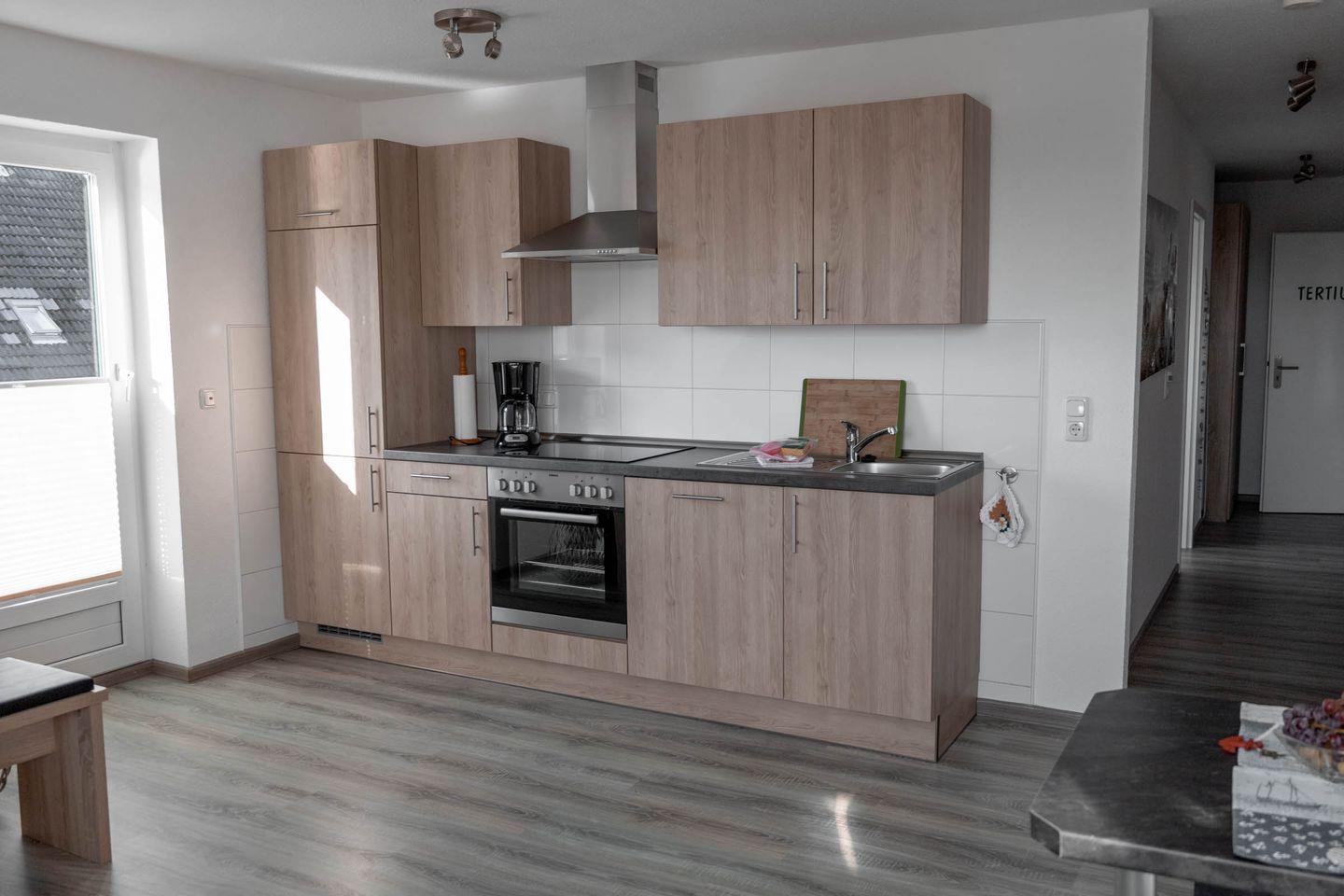 Die offene Küche ist zum Wohnzimmer hin ausgerichtet und verfügt über eine hochwertige Ceran-Kochfläche, einen Backofen, einen Kühlschrank sowie eine Spülmaschine. Ergänzt wird die Küchenausstattung durch eine Kaffeemaschine, einen Toaster, einen Wasserkocher sowie sämtliche notwendigen Küchenutensilien, Geschirr und Besteck. Ein Esstisch im Essbereich eignet sich ideal für gemeinsame Mahlzeiten.