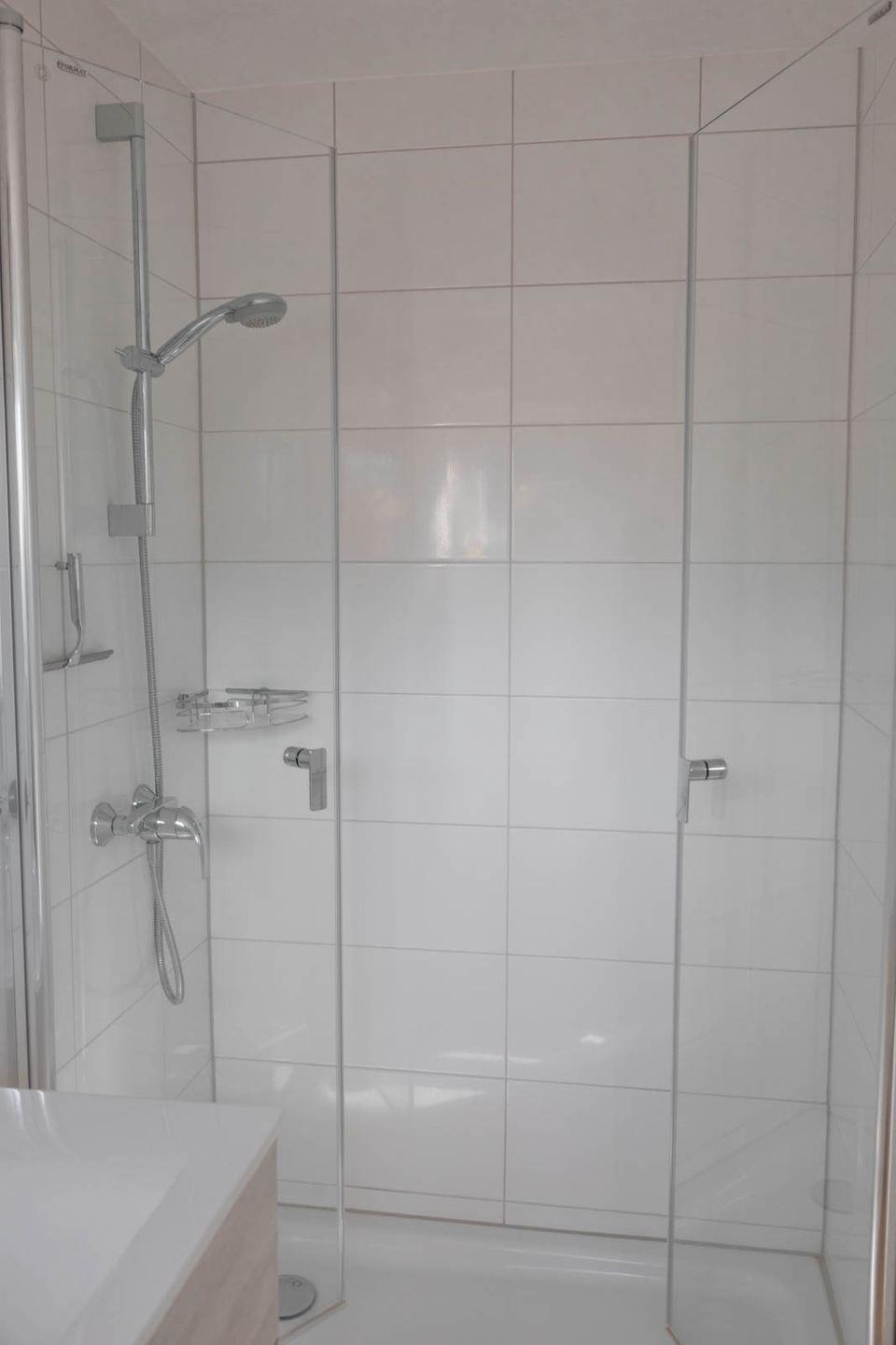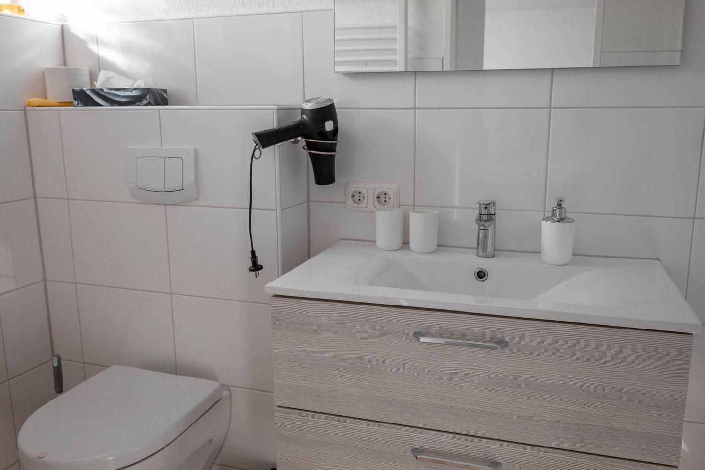 Das Badezimmer präsentiert sich mit einer bodengleichen XL Dusche, WC, Waschbecken, Spiegel und Kosmetikspiegel sowie einem Haartrockner.
