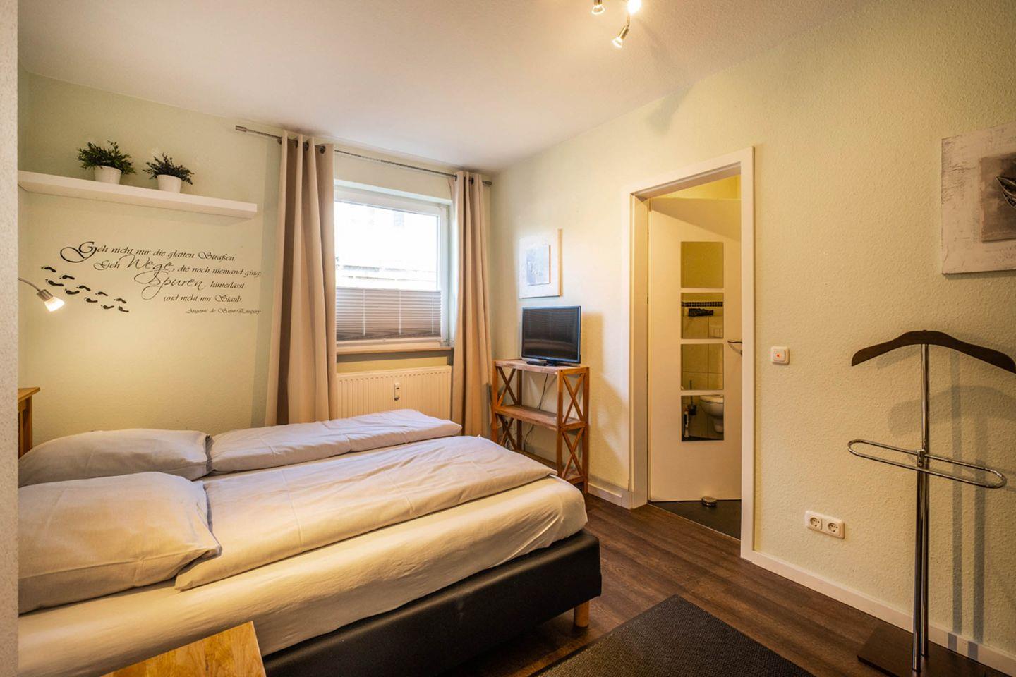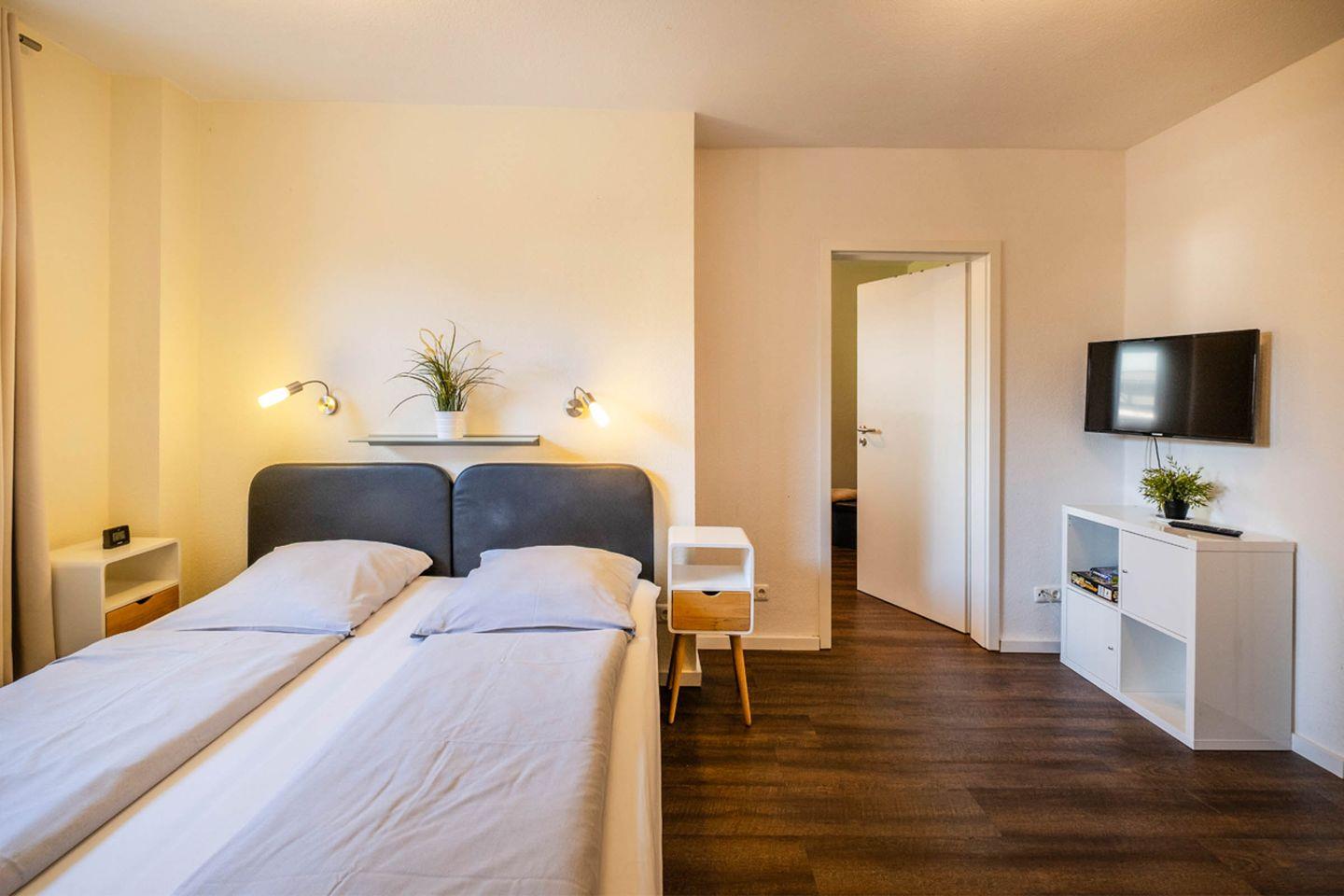 1 Schlafzimmer mit einem Doppelbett und TV