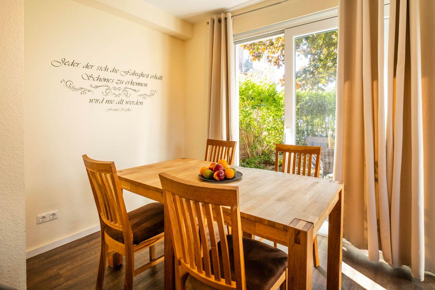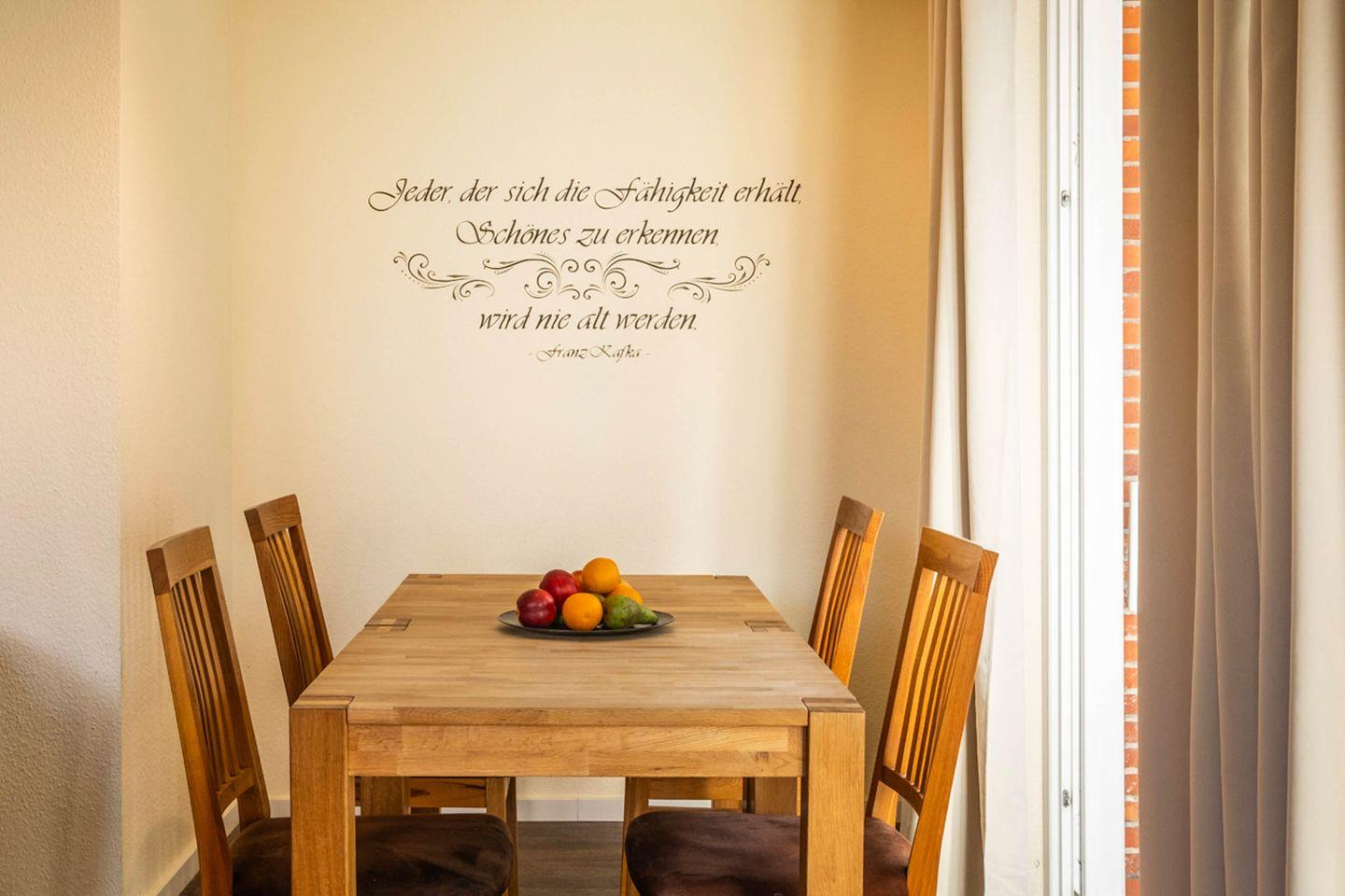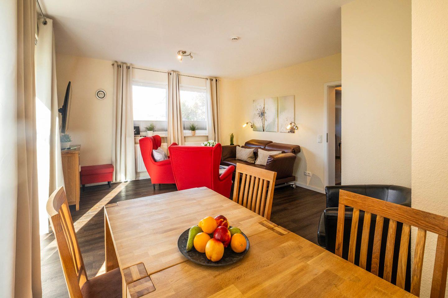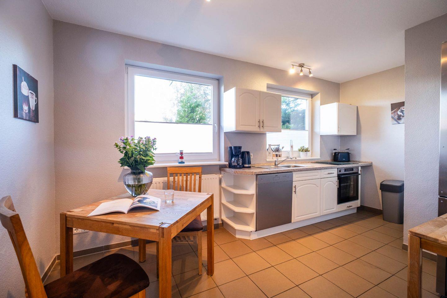 Im stilvoll eingerichteten Wohnzimmer erwartet Sie nicht nur eine gemütliche Sofaecke mit zusätzlichem Sessel. Ein Essbereich mit Esstisch schafft einen angenehmen Rahmen für gemeinsame Mahlzeiten. Die offene, voll ausgestattete Küche ist zum Wohnzimmer hin ausgerichtet und verfügt unter anderem über einen Ceran-Herd, Backofen, Kühlschrank mit Gefrierfach, Mikrowelle, Spülmaschine, Wasserkocher, Kaffeemaschine und Toaster. Hochwertige Küchenutensilien, Geschirr, Besteck und Geschirrhandtücher sind ebenfalls vorhanden, sodass Sie alle Annehmlichkeiten für die Selbstverpflegung genießen können.