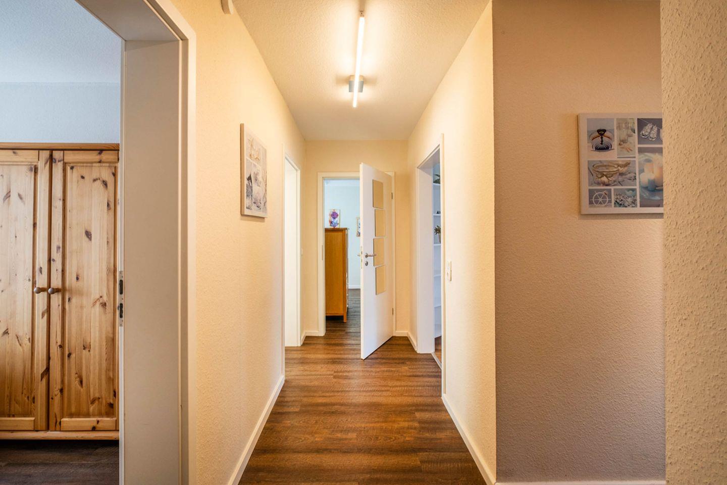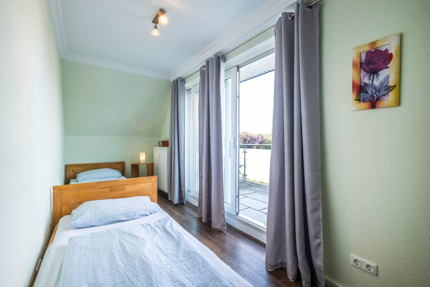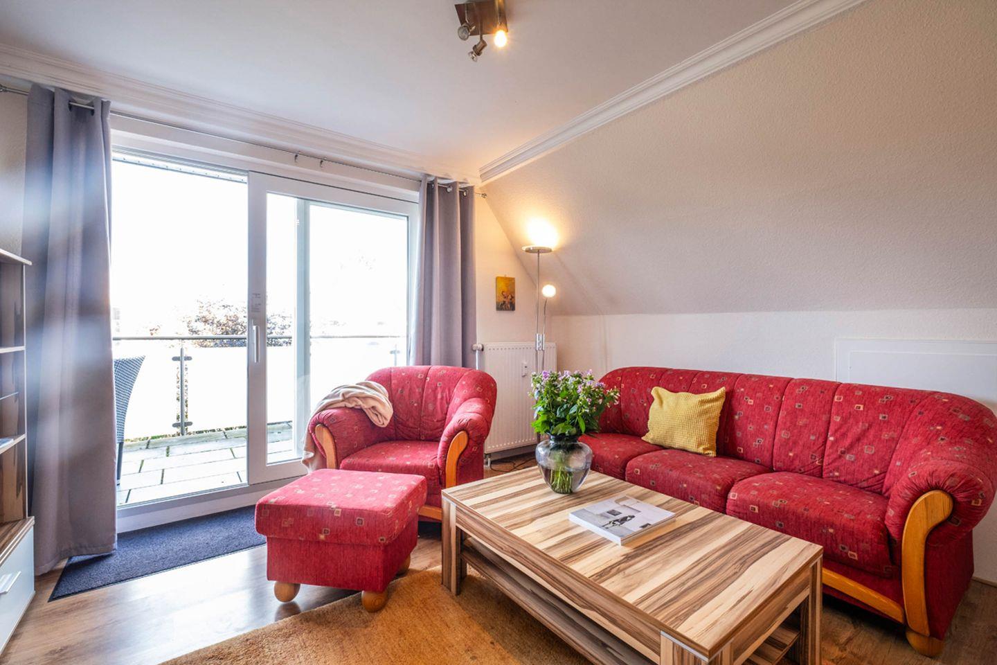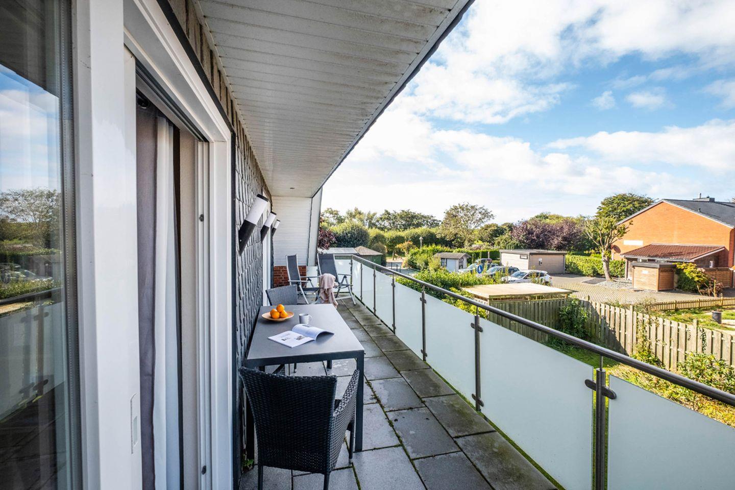 Insgesamt stehen Ihnen vier Zimmer zur Verfügung: Neben den Schlafzimmern gibt es ein großzügiges Wohnzimmer, das mit einer gemütlichen Sofaecke, Sessel, Essbereich und einen Fernsehr zum Verweilen einlädt. Die bodengleiche Dusche in einem der beiden modernen Badezimmer unterstreicht den hohen Komfortstandard. Für den besonderen Start in den Tag oder entspannte Abendstunden bietet sich der eigene Balkon an, auf dem Sie die frische Nordseeluft genießen können.