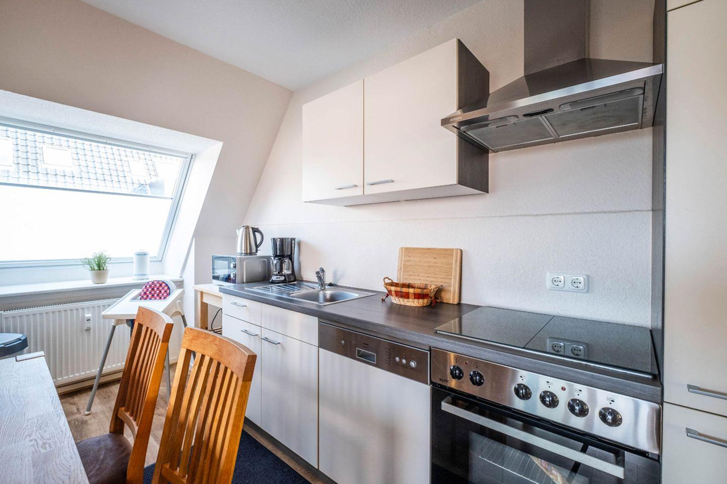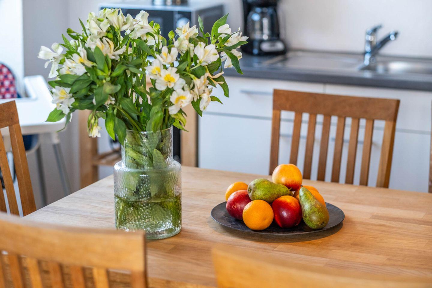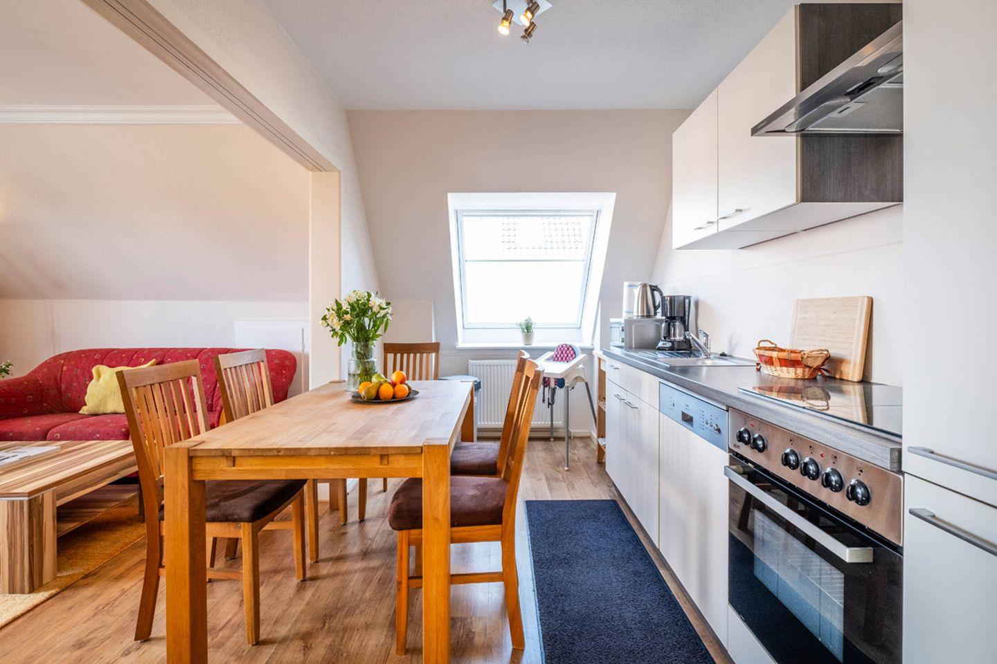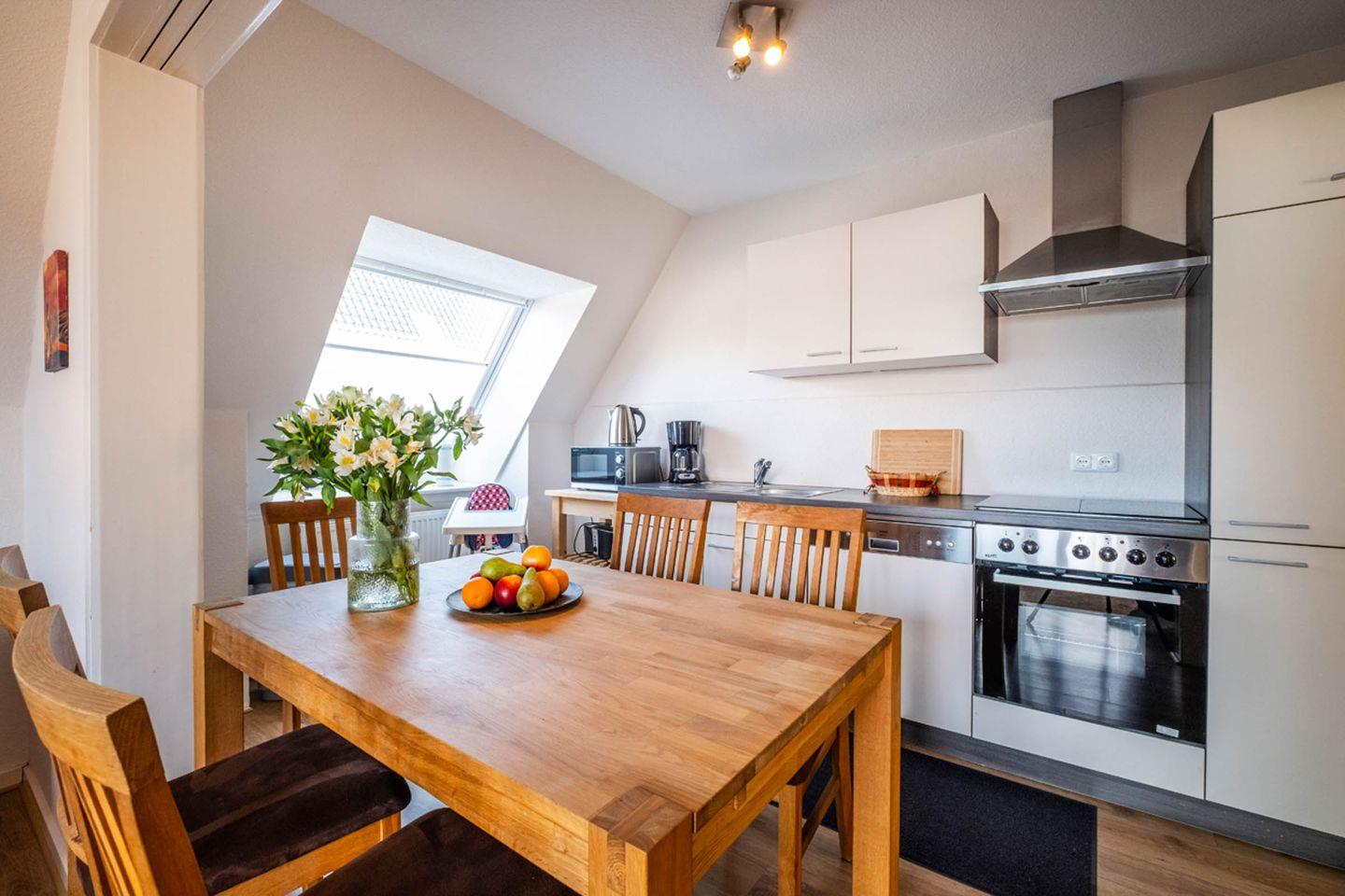 Ein weiteres Highlight ist die offene Küche, die sich harmonisch in den Wohnbereich einfügt und keine Wünsche offenlässt. Sie finden dort eine Spülmaschine, Mikrowelle, Ceranherd, Backofen, Toaster, Wasserkocher, Kaffeemaschine, Kühlschrank mit Gefrierfach sowie umfangreiches Geschirr, Besteck und Küchenutensilien. Ein Esstisch lädt dazu ein, gemeinsam gekochte Mahlzeiten oder ein Frühstück in entspannter Atmosphäre zu genießen.