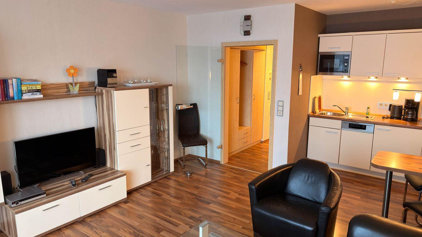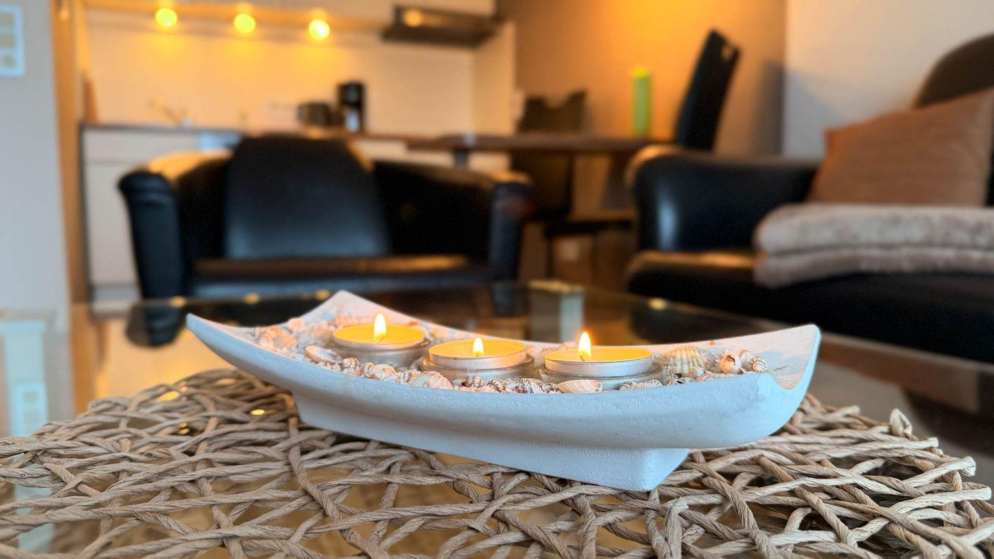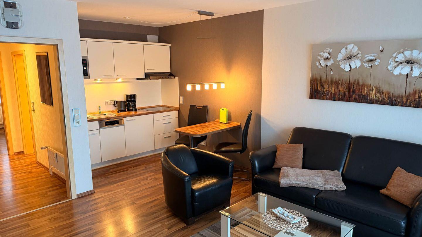 Das helle Wohnzimmer ist mit einer gemütlichen Sofaecke, einem Sessel sowie einem Esstisch ausgestattet und lädt zum Verweilen ein. Vinylböden sorgen sowohl im Wohn- als auch im Schlafzimmer für eine angenehme und pflegeleichte Atmosphäre. Die moderne, offen zum Wohnzimmer gestaltete Küche bietet Ihnen einen Cerankochfeld, einen Backofen, eine Spülmaschine, einen Kühlschrank mit Gefrierfach sowie sämtliche Küchenutensilien, Geschirr und Besteck. Auch eine Kaffeemaschine und Geschirrhandtücher sind vorhanden. So können Sie auch im Urlaub bequem kochen und speisen.