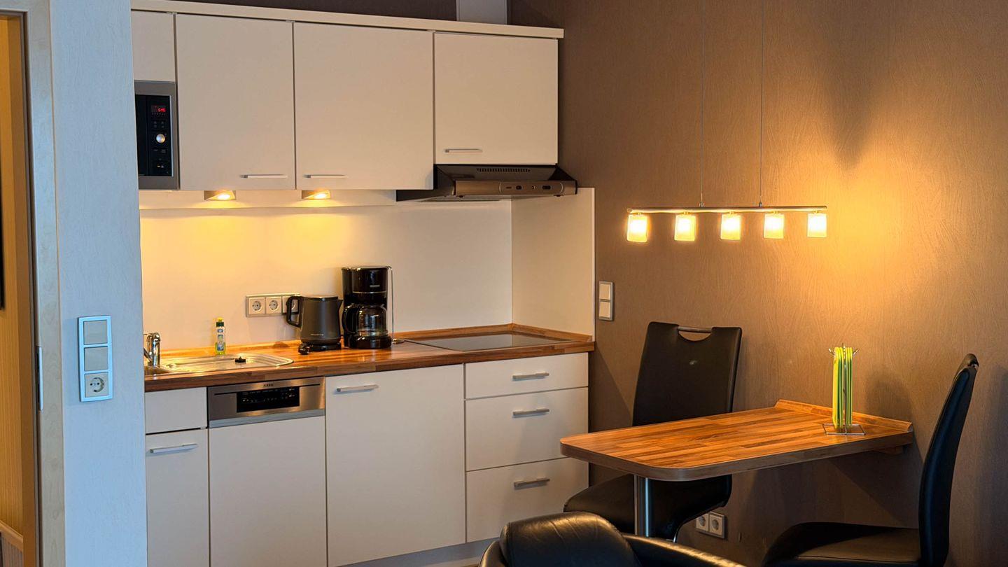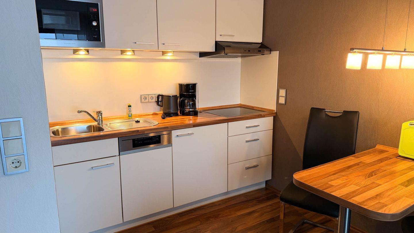 Küchenbereich: Cerankochfeld, Kühlschrank mit Gefrierfach, Filterkaffeemaschine, Wasserkocher, Toaster.