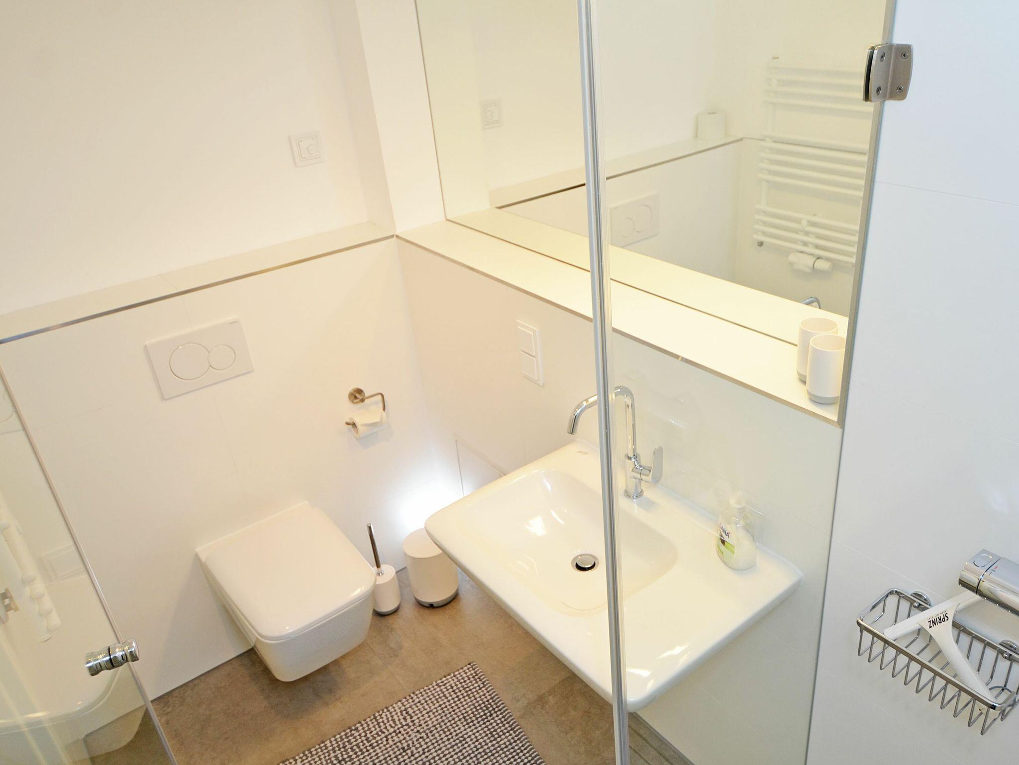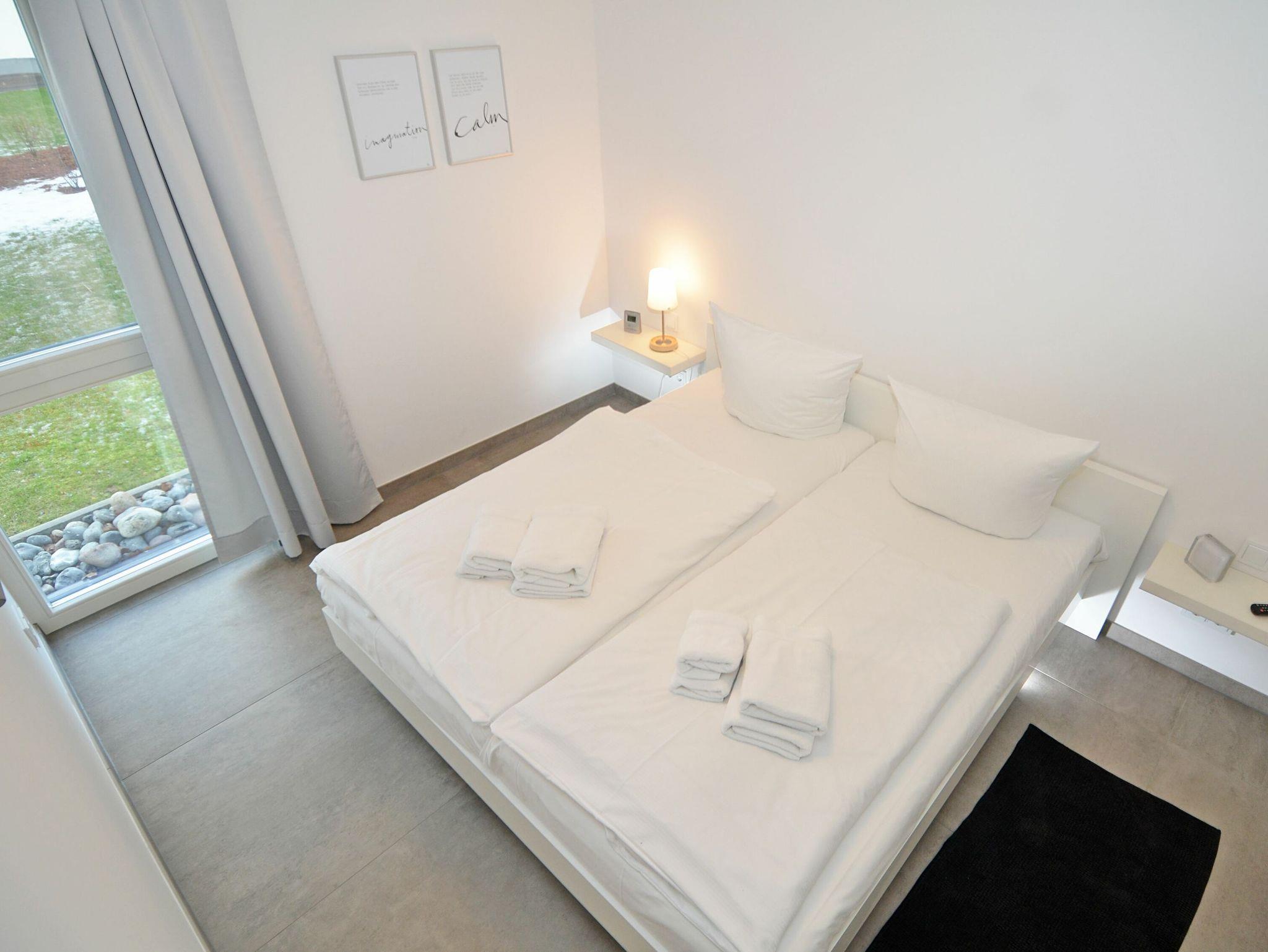 Zur Verfügung stehen zwei Bäder mit jeweils großen ebenerdigen Duschen, zwei Schlafzimmer mit Fernsehern und einem Doppelbett bzw. zwei Einzelbetten (1,00m x 2,00m). Im Wohnbereich bietet ein Schlafsofa (1,60 x 2,00 m) eine zusätzliche Übernachtungsmöglichkeit für weitere zwei Gäste.